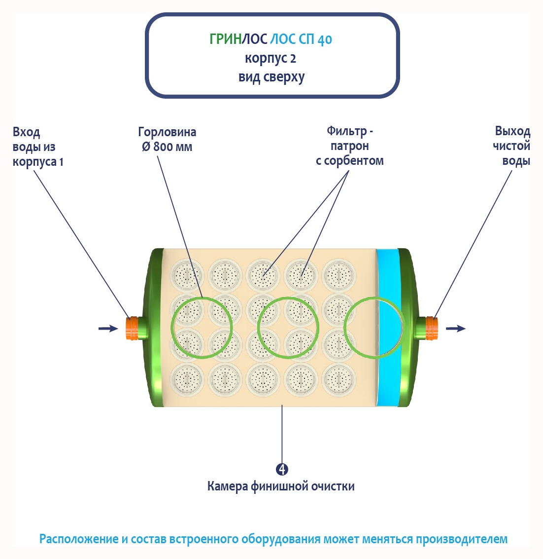 Далее стоки попадают в камеру финишной очистки ливневой канализации ГРИНЛОС Ливневая канализация 40-2300-2 стеклопластиковая и проходят через фильтр-патрон с сорбентом.