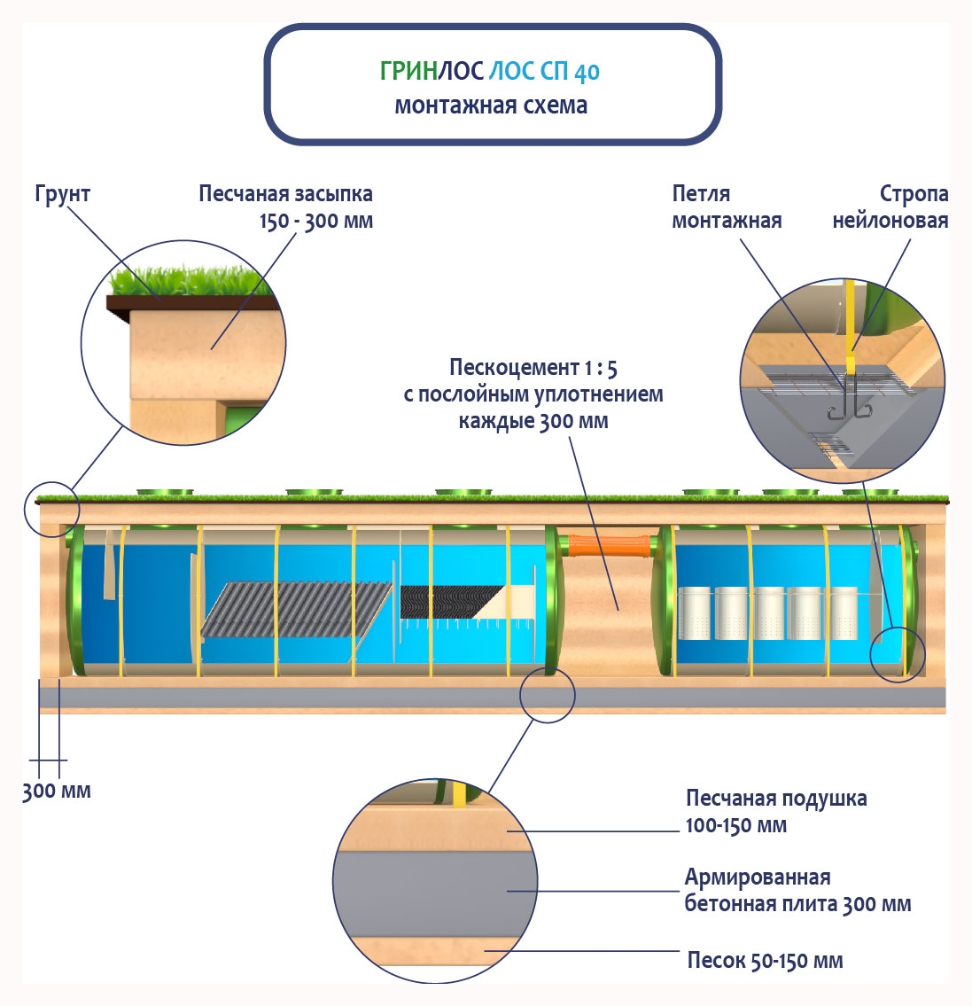 При заглублении ЛОС из стеклопластика на глубину не более 250 мм от верхнего пластикового горизонтального перекрытия до запланированного уровня земли, в однородных грунтах с низким уровнем вод обратную обсыпку допустимо производить песком, смешанным с цементом (марка не ниже М500). Соотношение цемента и песка для обсыпки составляет 1:5. Песчано-цементная засыпка производится послойно, с обязательным трамбованием и проливкой водой каждого слоя. Толщина каждого слоя 300 мм. При условии уровня грунтовых вод выше 1500 мм от уровня земли, при наличии плывуна, скальных грунтов и прочих нестандартных ситуациях, а также в случае заглубления ЛК 40-2300-2 Сп более чем на 250 мм песчано-цементную смесь необходимо заменить бетоном. Одновременно с засыпкой ливневой канализации, она заполняется водой. Уровень воды должен превышать уровень засыпки (бетонирования) не менее, чем на 200 мм и не более, чем на 500 мм.