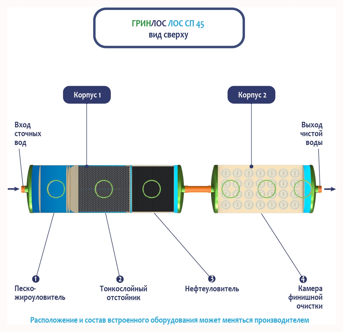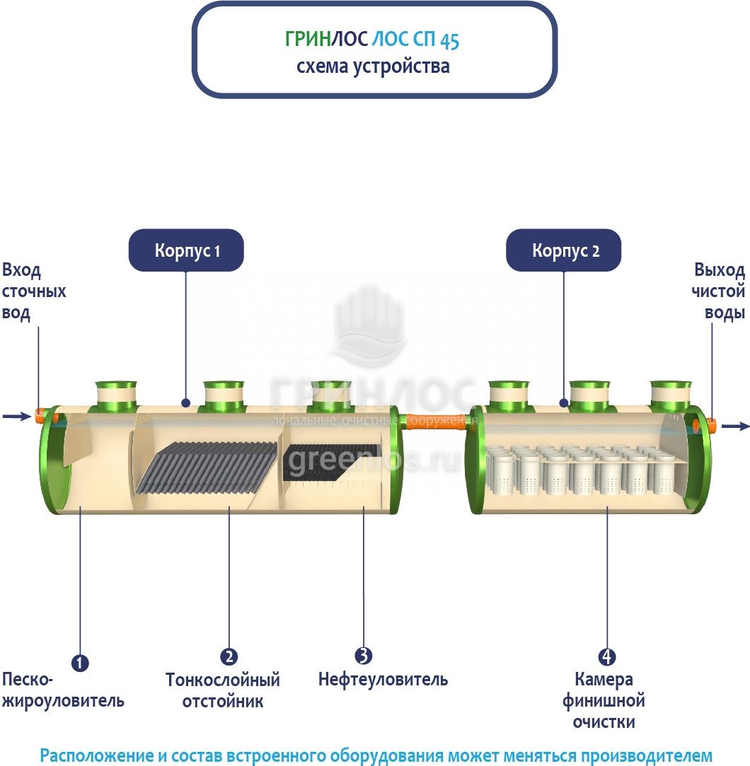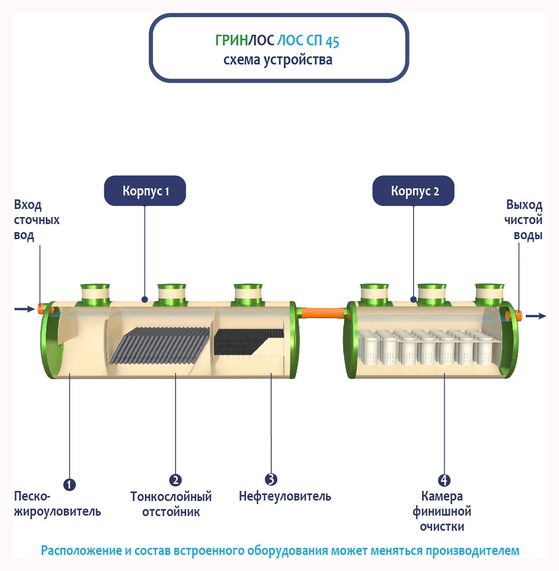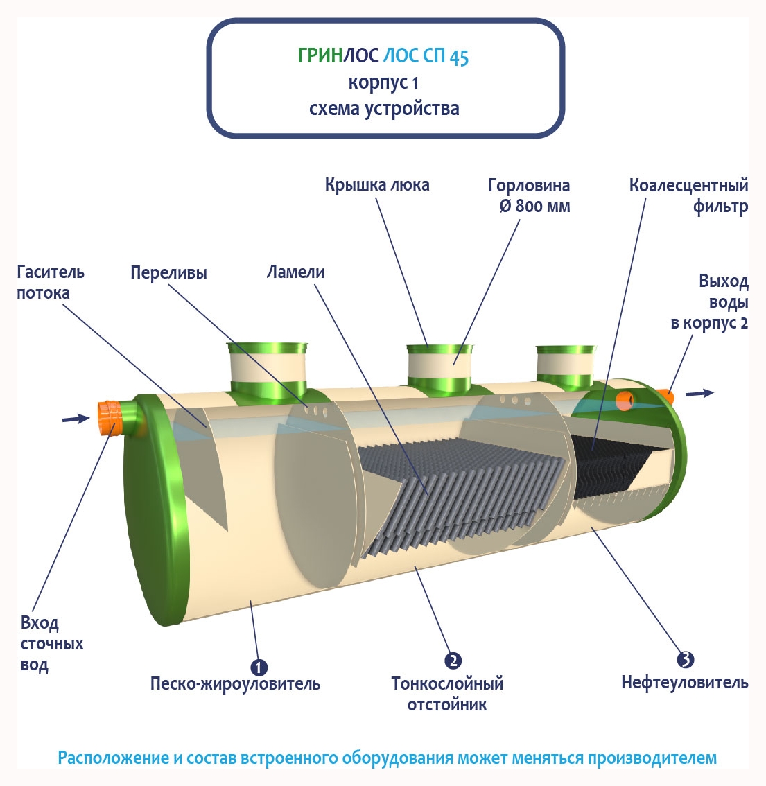 В базовую комплектацию Ливневой канализации Гринлос входит нефтеловушка, которая работает по принципу отстаивания стоков