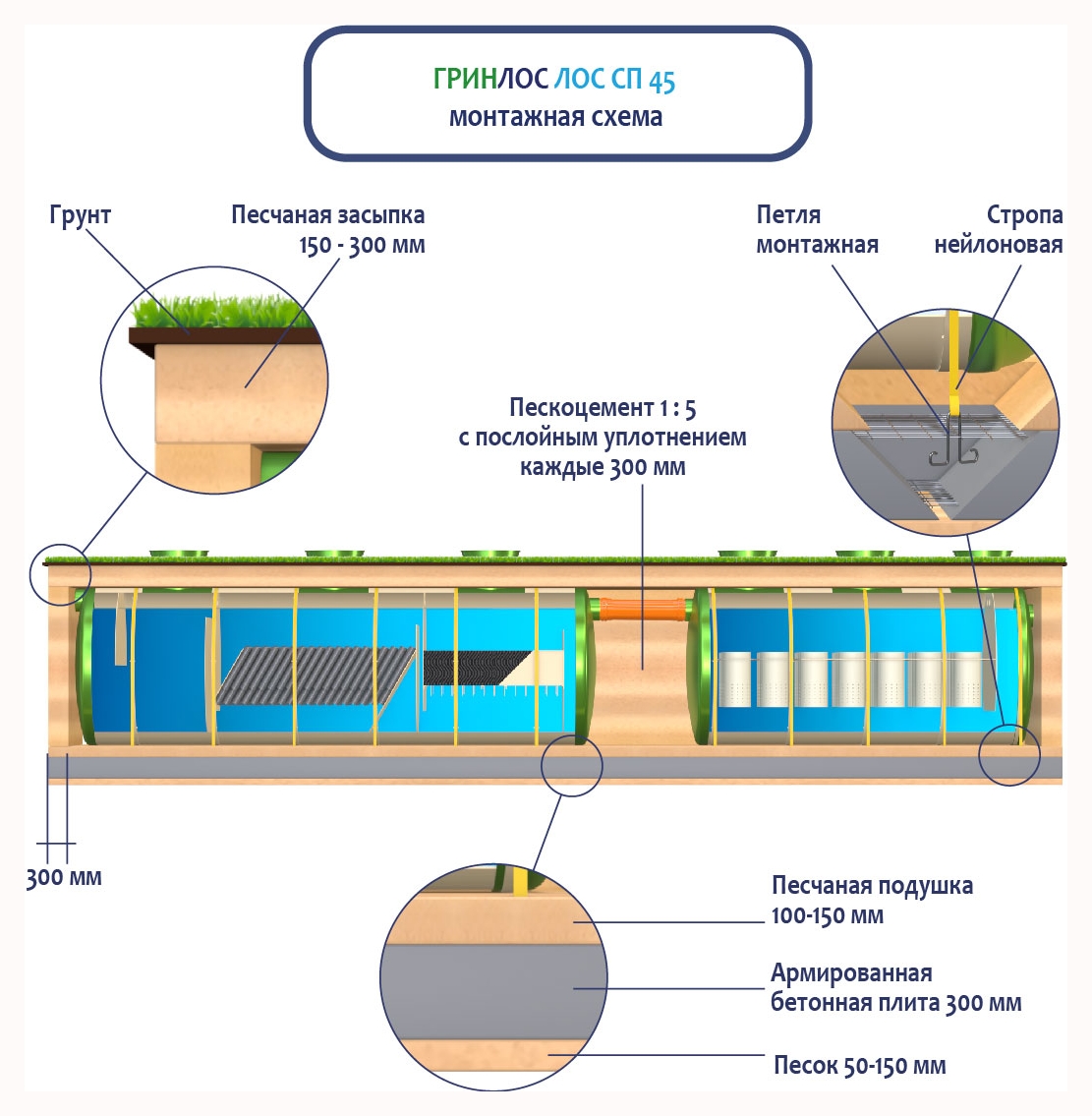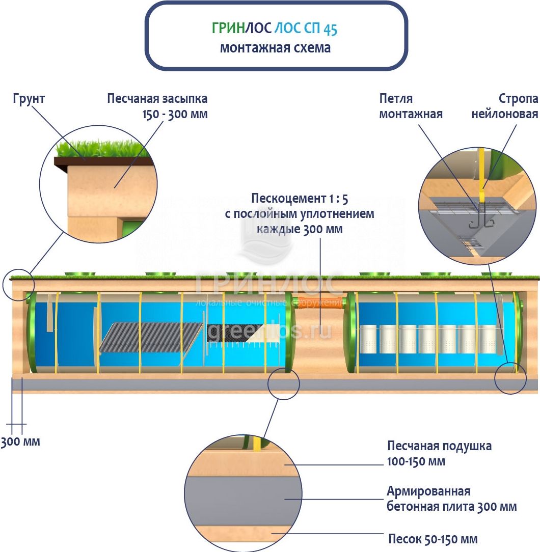 При заглублении ЛОС из стеклопластика на глубину не более 250 мм от верхнего пластикового горизонтального перекрытия до запланированного уровня земли, в однородных грунтах с низким уровнем вод обратную обсыпку допустимо производить песком, смешанным с цементом (марка не ниже М500). Соотношение цемента и песка для обсыпки составляет 1:5. Песчано-цементная засыпка производится послойно, с обязательным трамбованием и проливкой водой каждого слоя. Толщина каждого слоя 300 мм. При условии уровня грунтовых вод выше 1500 мм от уровня земли, при наличии плывуна, скальных грунтов и прочих нестандартных ситуациях, а также в случае заглубления ЛК 45-2300-2 Сп более чем на 250 мм песчано-цементную смесь необходимо заменить бетоном. Одновременно с засыпкой ливневой канализации, она заполняется водой. Уровень воды должен превышать уровень засыпки (бетонирования) не менее, чем на 200 мм и не более, чем на 500 мм.