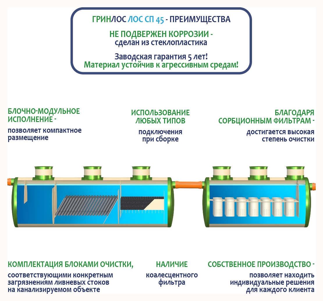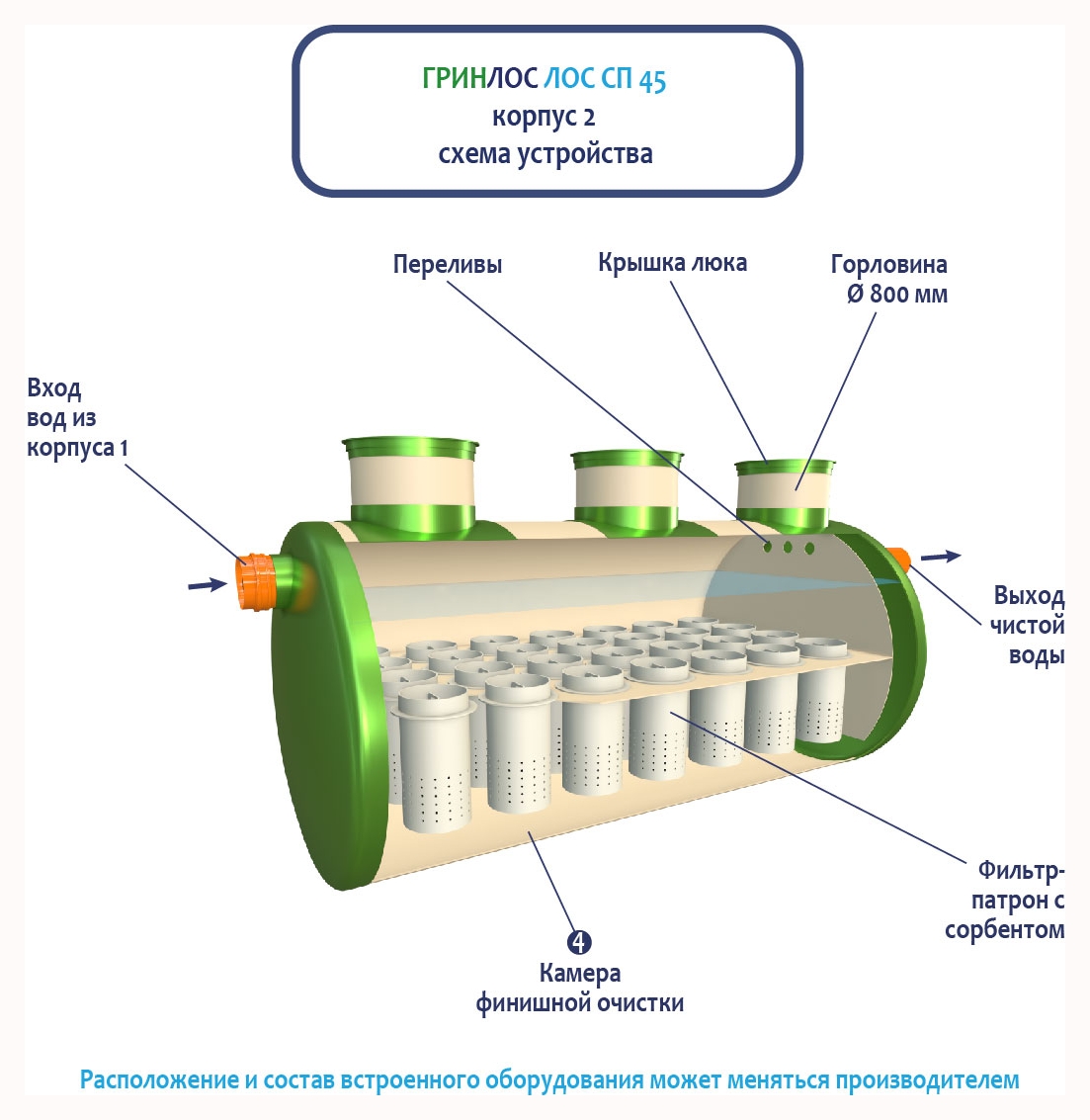 Ливневая канализация Гринлос ЛК 45-2300-2 Сп снабжена отсеком, в котором стоки проходят окончательную очистку через фильтр-патрон с сорбентом.