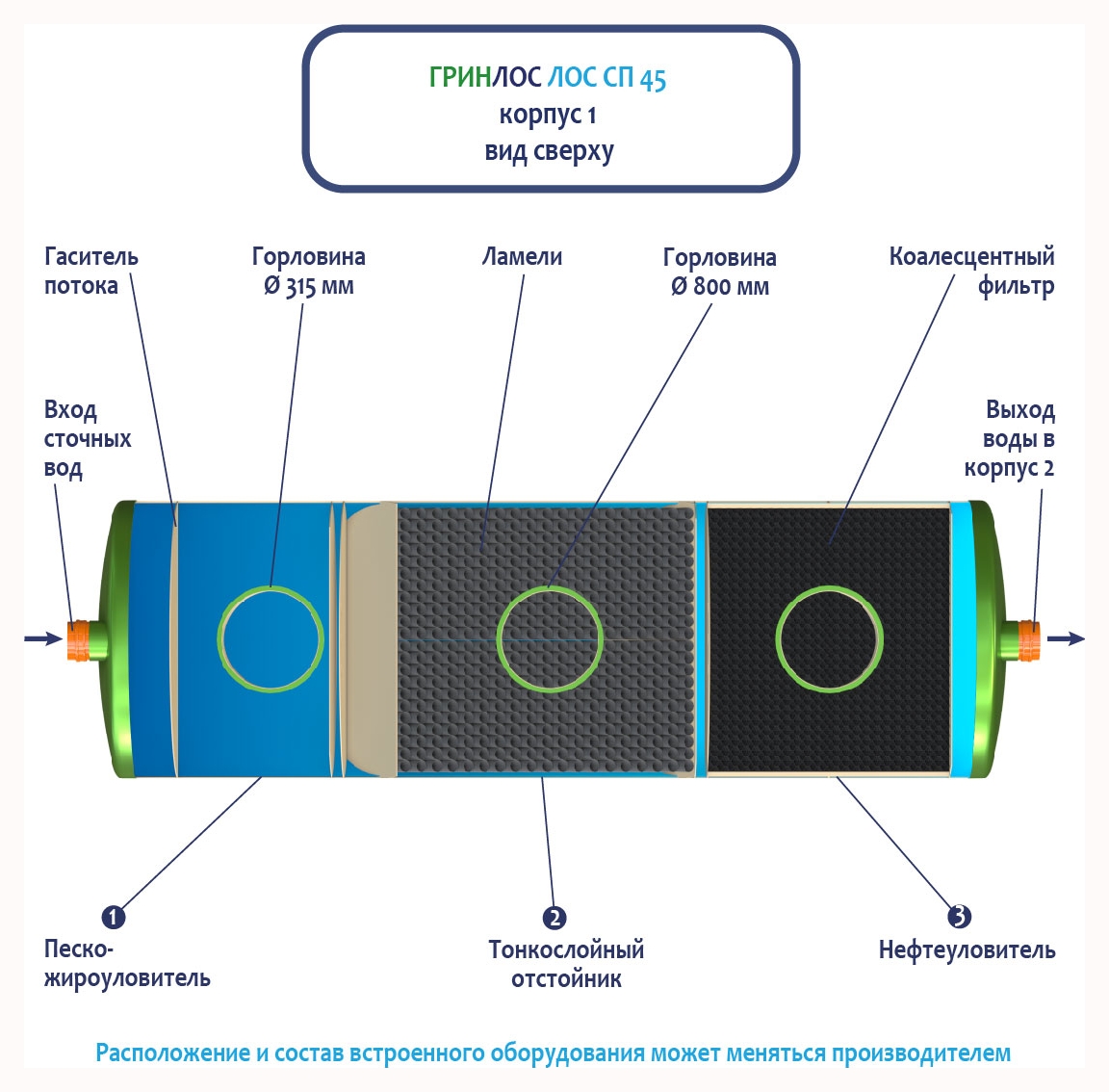 Конструктивно данное сооружение для очистки поверхностных вод представляет собой горизонтальную цилиндрическую ёмкость, разделенную внутри перегородками на отдельные блоки. Остальные блоки являются вертикальными или горизонтальными емкостными сооружениями, имеющими в своем составе перегородки, насосное оборудование, трубопроводы с запорной арматурой и лестницами для обслуживания.