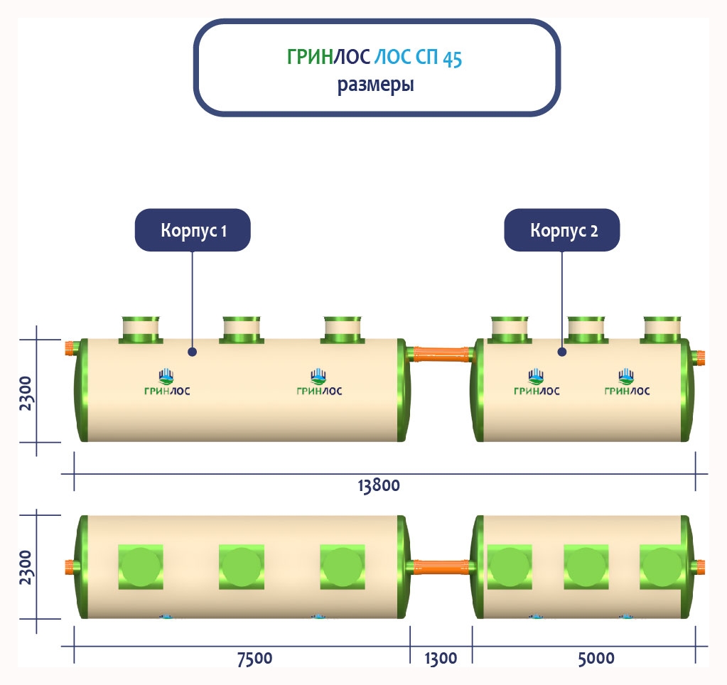 ГРИНЛОС Ливневая канализация 45-2300-2 стеклопластиковая представляет собой модульное очистное сооружение, состоящее из 2 корпусов размерами 7500*2300*2300 мм - 1 корпус, 5000*2300*2300 мм - 1 корпус. Объем отдельного корпуса 1 вида составляет 31.1 м3, 2 вида – 20.8 м3. Ввиду большого веса, для установки станции потребуется применение вспомогательного оборудования.