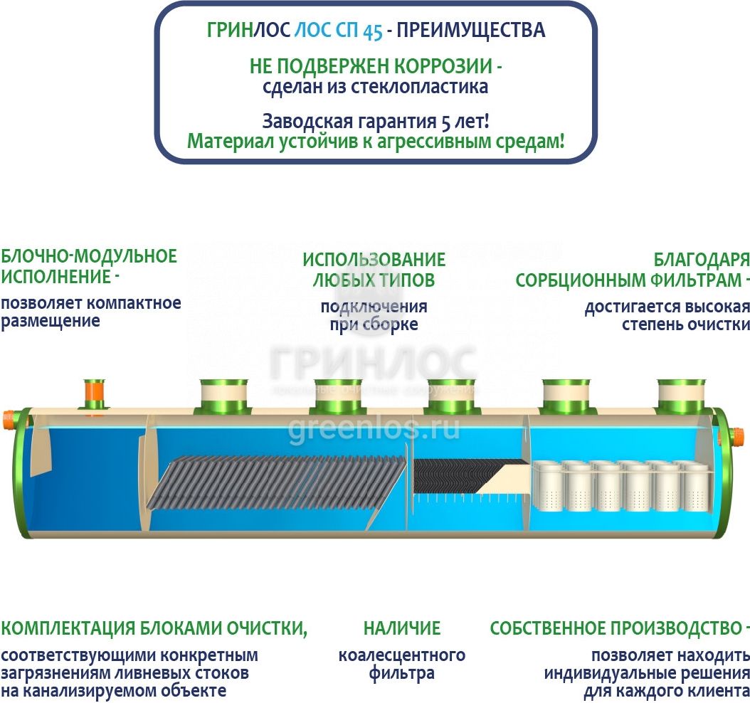 Гринлос ГРИНЛОС Ливневая канализация 45-2300 стеклопластиковая применяется в комплексах ливневой канализации промышленных площадок, торговых центров и АЗС, а также с районов жилой застройки, со складов, мостовых переходов и автодорог. Также находит применение при отведении производственных стоков, процесс очистки которых подразумевает отстаивание и фильтрацию на сорбирующих материалах в виде активированного угля.