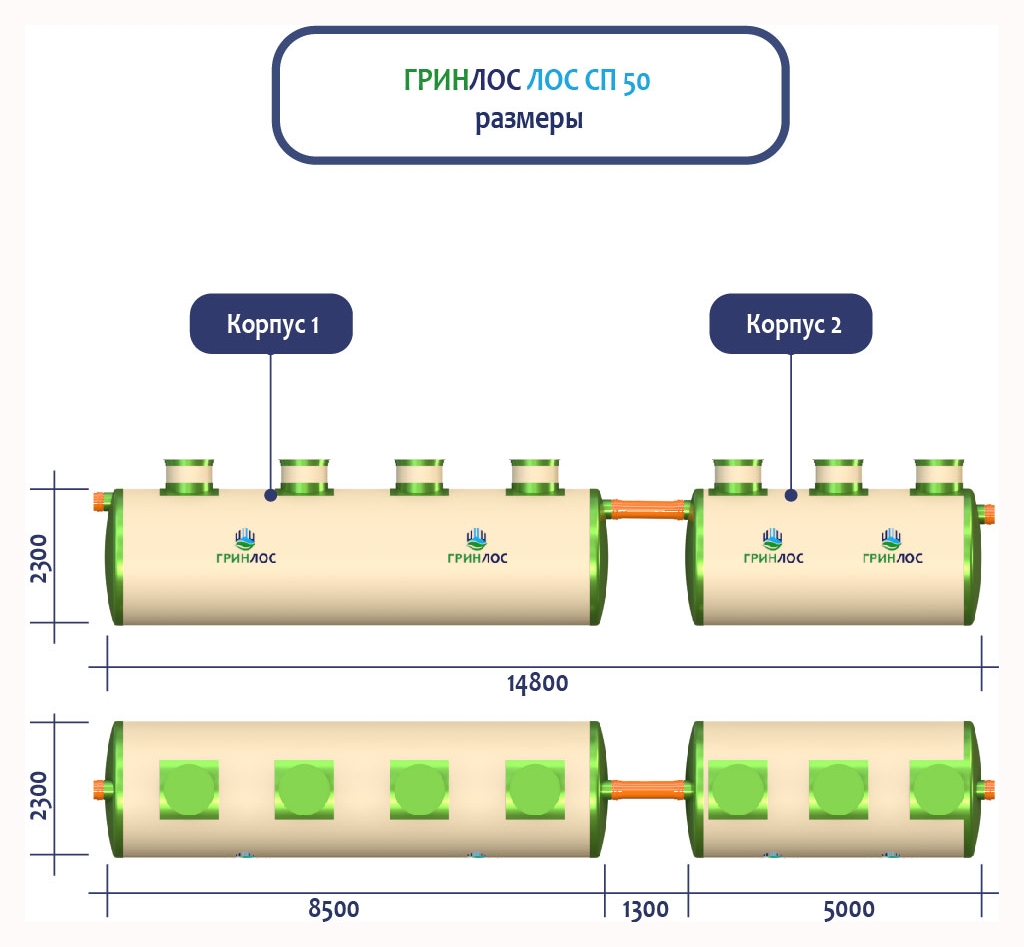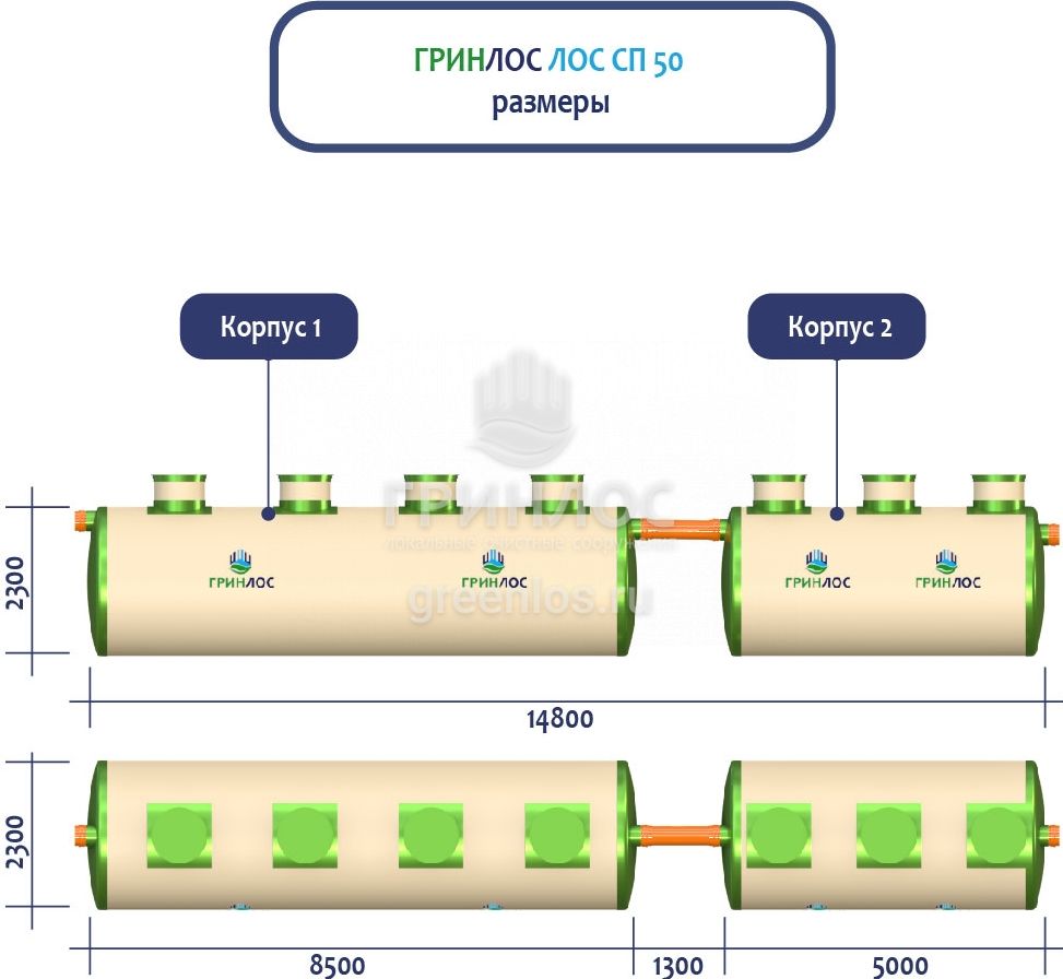 ГРИНЛОС Ливневая канализация 50-2300 стеклопластиковая представляет собой модульное очистное сооружение, состоящее из 2 корпусов размерами 8500*2300*2300 мм - 1 корпус, 5000*2300*2300 мм - 1 корпус. Объем отдельного корпуса 1 вида составляет 35.3 м3, 2 вида – 20.8 м3. Ввиду большого веса, для установки станции потребуется применение вспомогательного оборудования.