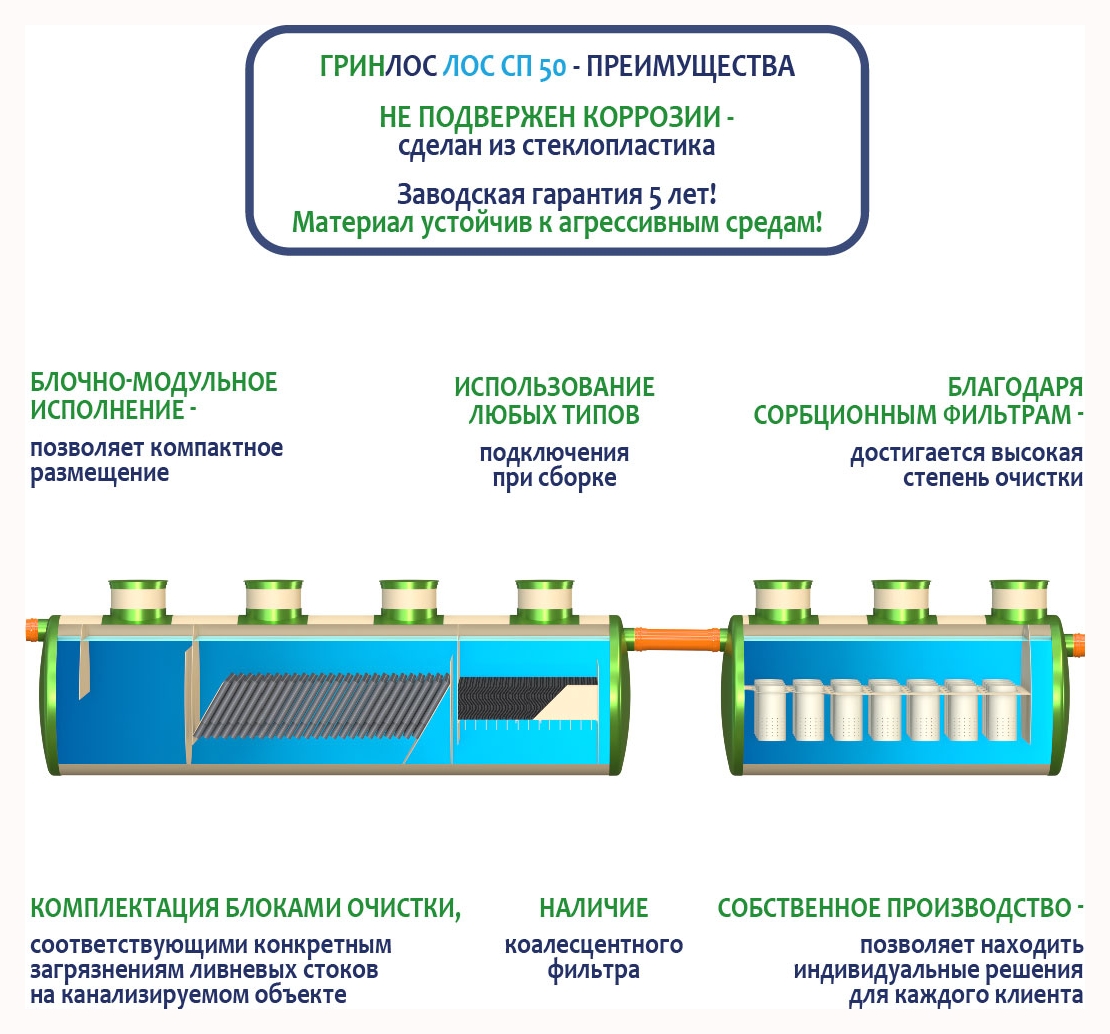 Ливневая канализация Гринлос ЛК 50-2300 Сп снабжена отсеком, в котором стоки проходят окончательную очистку через фильтр-патрон с сорбентом.