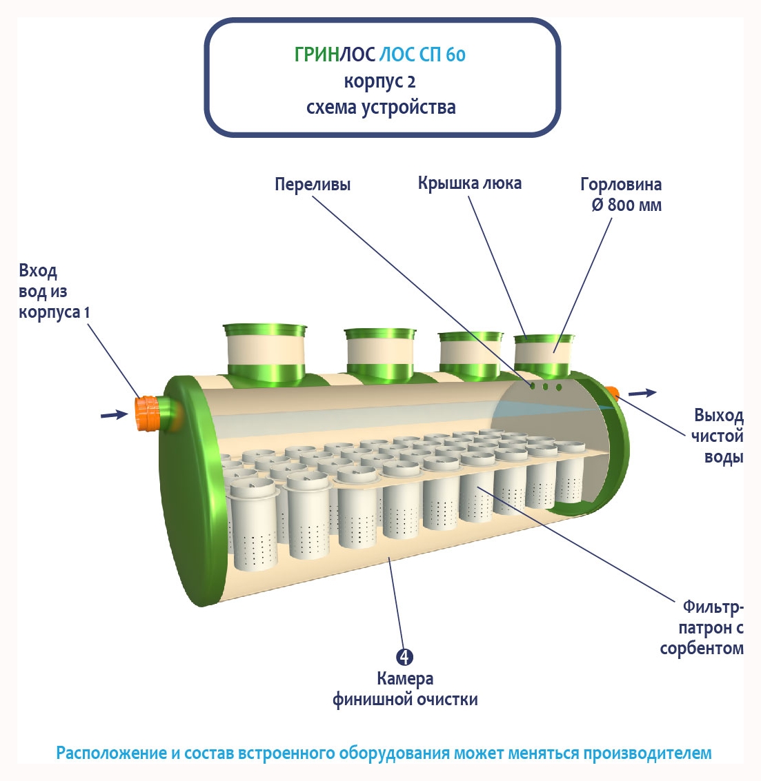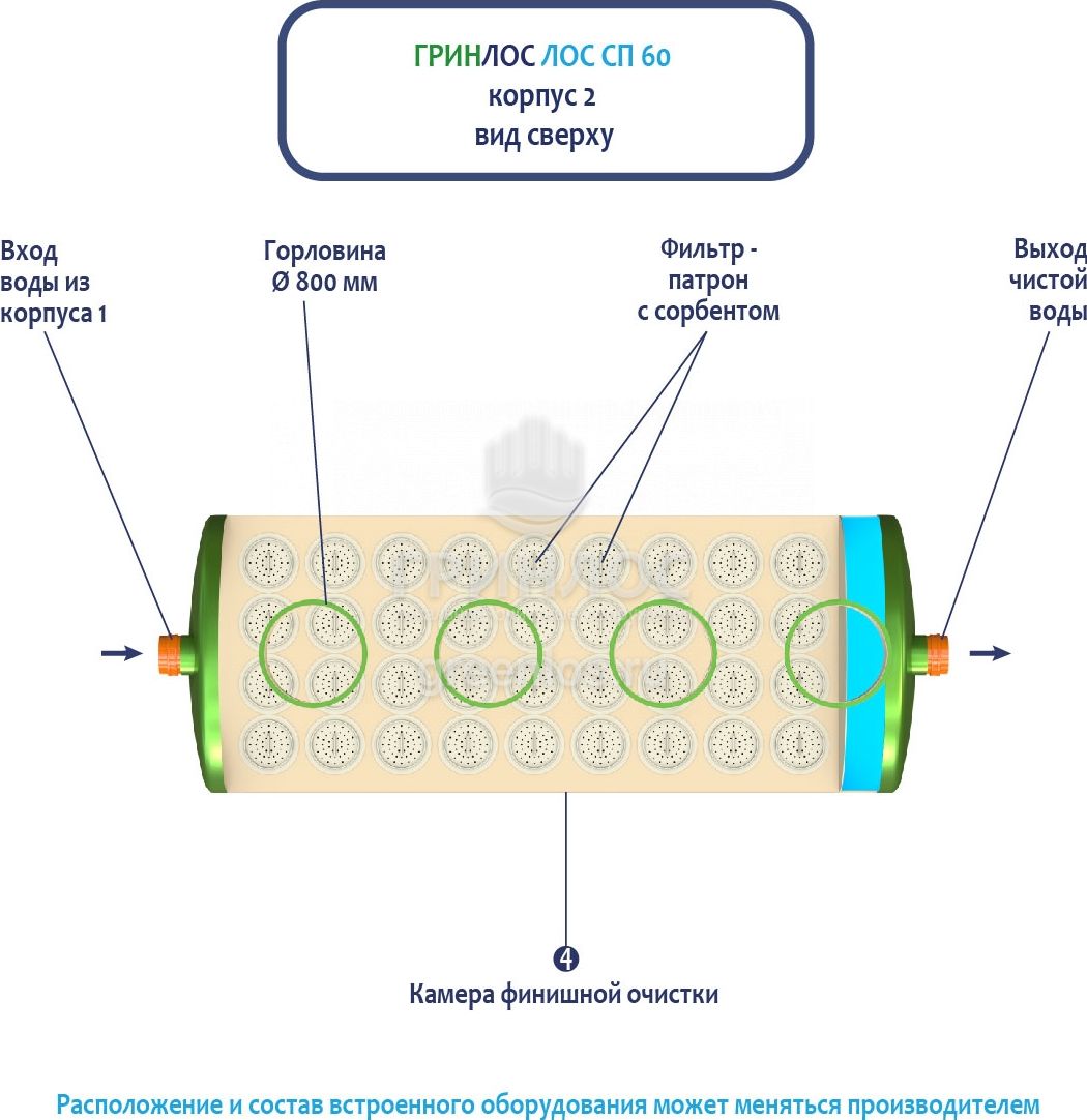 Далее стоки попадают в камеру финишной очистки ливневой канализации ГРИНЛОС Ливневая канализация 60-2300 стеклопластиковая и проходят через фильтр-патрон с сорбентом.