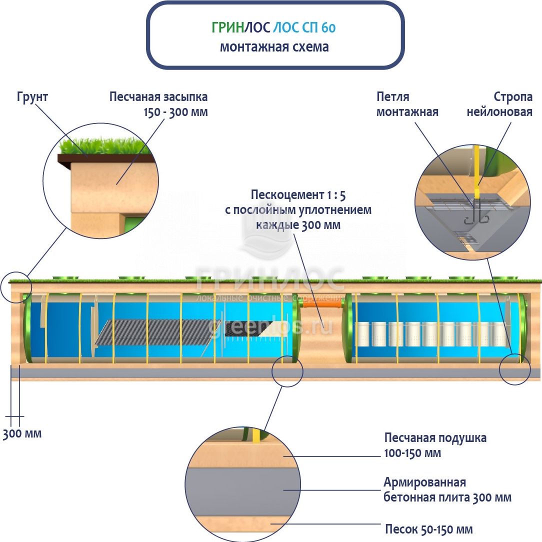 При заглублении ЛОС из стеклопластика на глубину не более 250 мм от верхнего пластикового горизонтального перекрытия до запланированного уровня земли, в однородных грунтах с низким уровнем вод обратную обсыпку допустимо производить песком, смешанным с цементом (марка не ниже М500). Соотношение цемента и песка для обсыпки составляет 1:5. Песчано-цементная засыпка производится послойно, с обязательным трамбованием и проливкой водой каждого слоя. Толщина каждого слоя 300 мм. При условии уровня грунтовых вод выше 1500 мм от уровня земли, при наличии плывуна, скальных грунтов и прочих нестандартных ситуациях, а также в случае заглубления ЛК 60-2300 Сп более чем на 250 мм песчано-цементную смесь необходимо заменить бетоном. Одновременно с засыпкой ливневой канализации, она заполняется водой. Уровень воды должен превышать уровень засыпки (бетонирования) не менее, чем на 200 мм и не более, чем на 500 мм.
