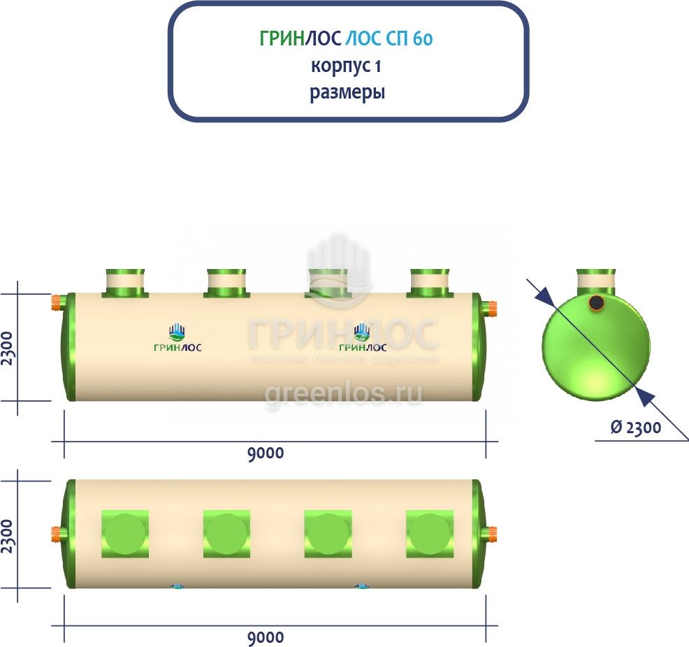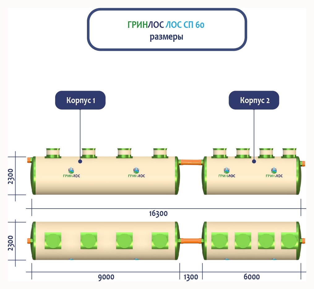 ГРИНЛОС Ливневая канализация 60-2300 стеклопластиковая представляет собой модульное очистное сооружение, состоящее из 2 корпусов размерами 9000*2300*2300 мм - 1 корпус, 6000*2300*2300 мм - 1 корпус. Объем отдельного корпуса 1 вида составляет 37.4 м3, 2 вида – 24.9 м3. Ввиду большого веса, для установки станции потребуется применение вспомогательного оборудования.