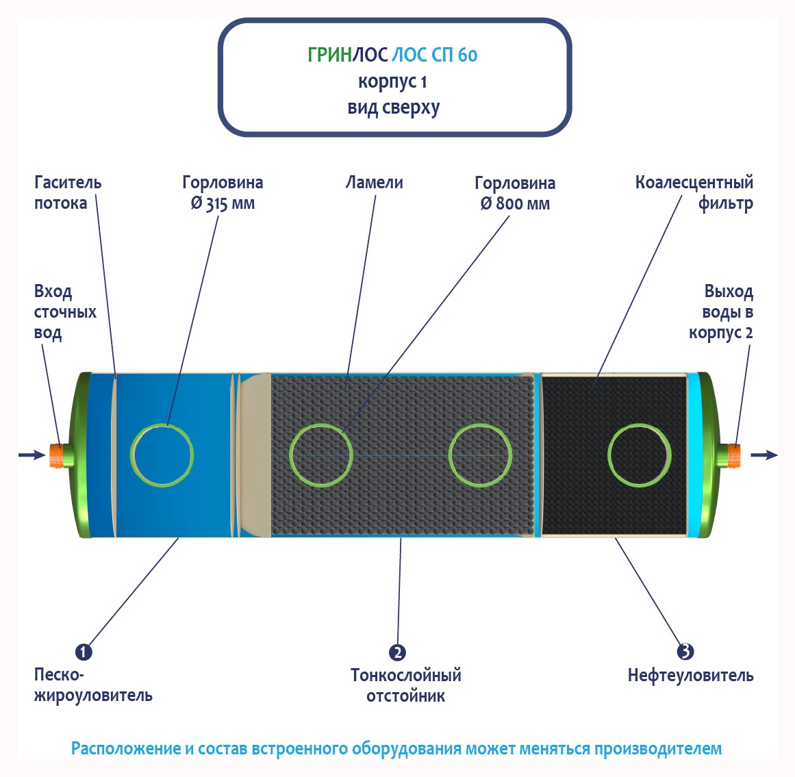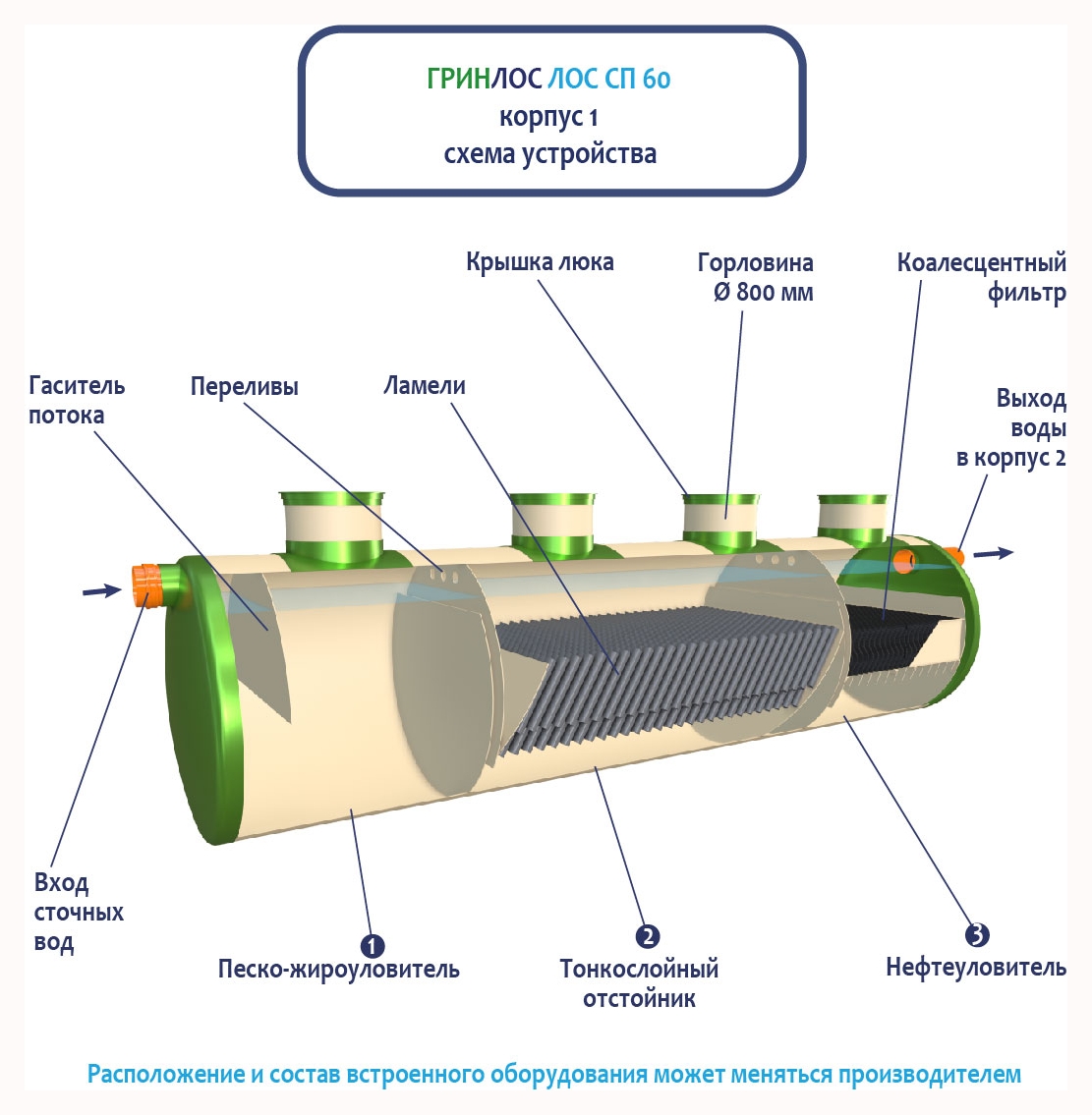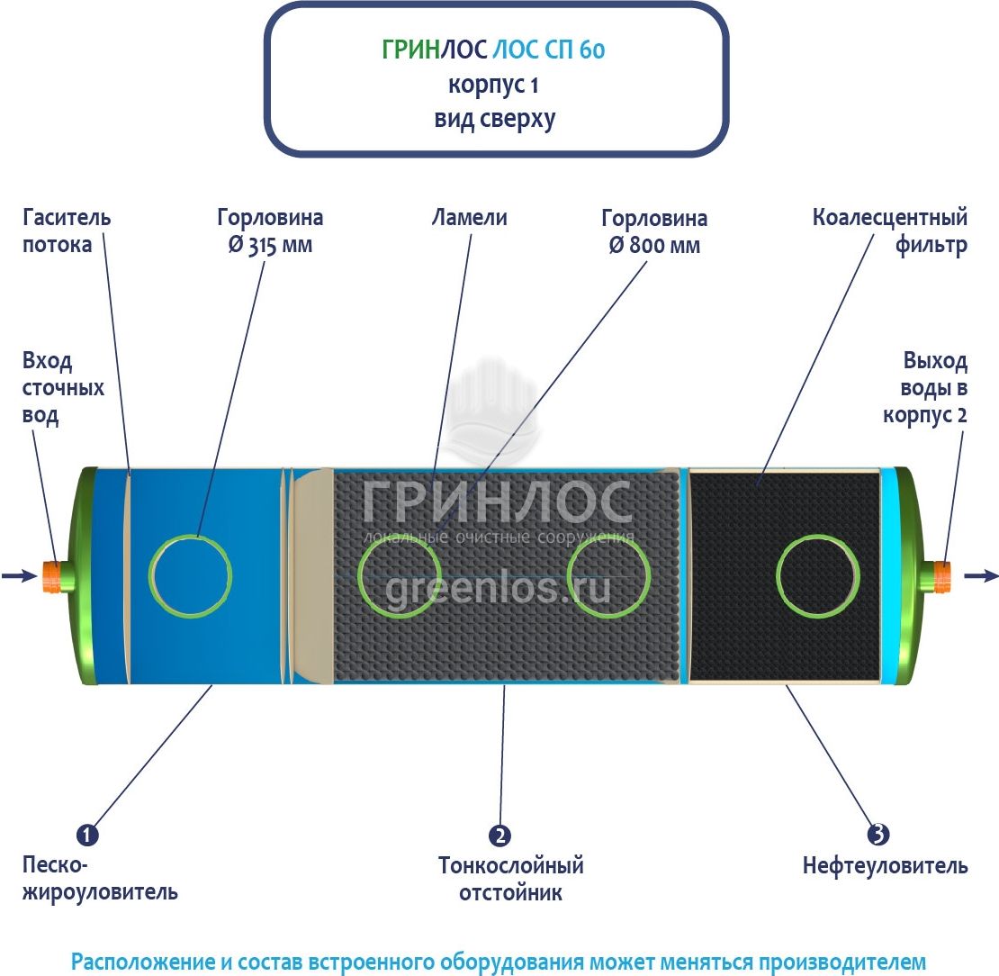 Стоки через входной патрубок корпуса Гринлос ГРИНЛОС Ливневая канализация 60-2300 стеклопластиковая попадают в песко-жироуловитель, где под воздействием седиментации из стоков выделяются взвеси и маслянистые вещества, за счет разницы плотностей твердые частицы оседают на дно, жиры собираются на поверхности.