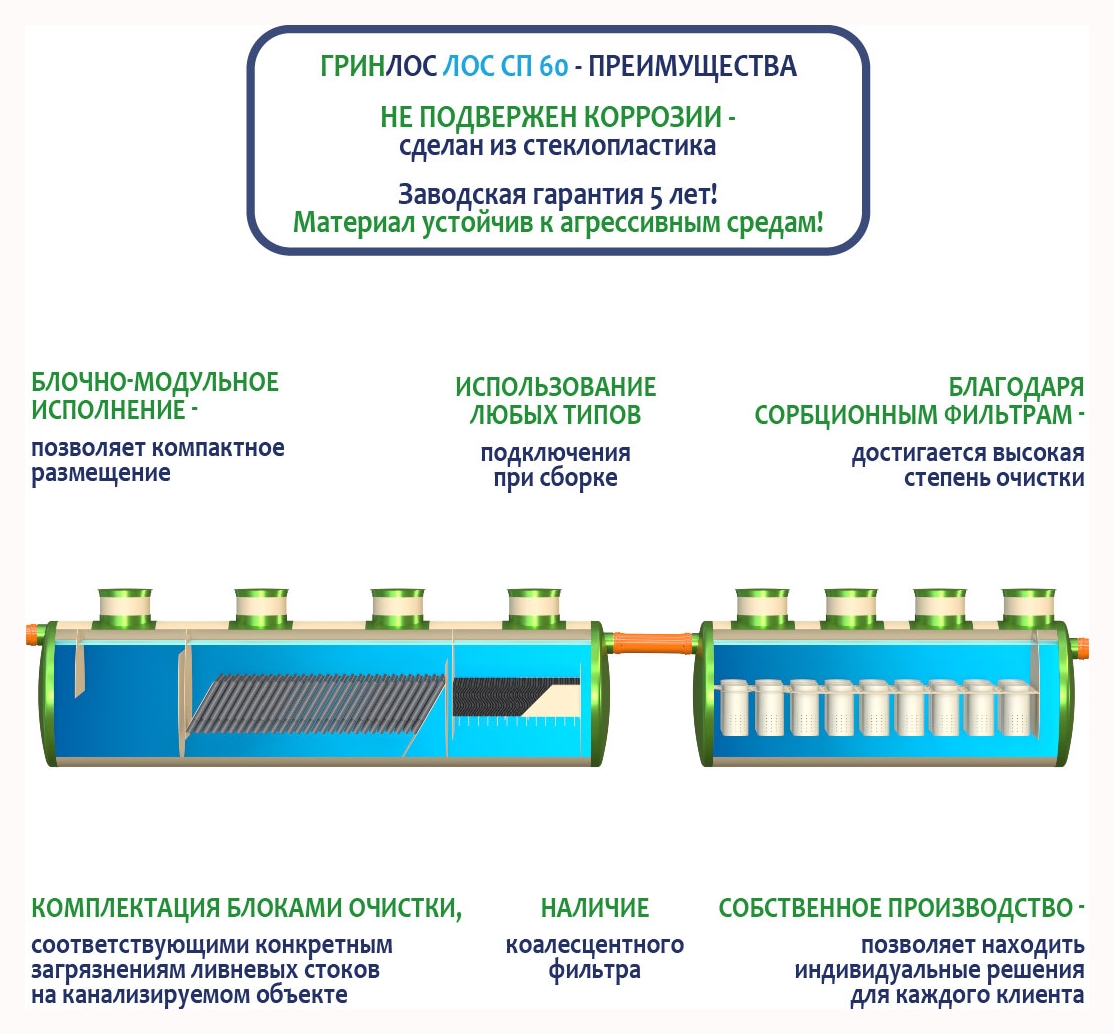Гринлос ГРИНЛОС Ливневая канализация 60-2300 стеклопластиковая применяется в комплексах ливневой канализации промышленных площадок, торговых центров и АЗС, а также с районов жилой застройки, со складов, мостовых переходов и автодорог. Также находит применение при отведении производственных стоков, процесс очистки которых подразумевает отстаивание и фильтрацию на сорбирующих материалах в виде активированного угля.