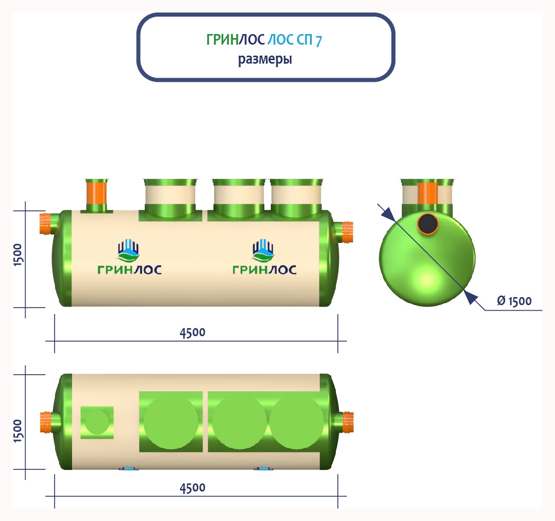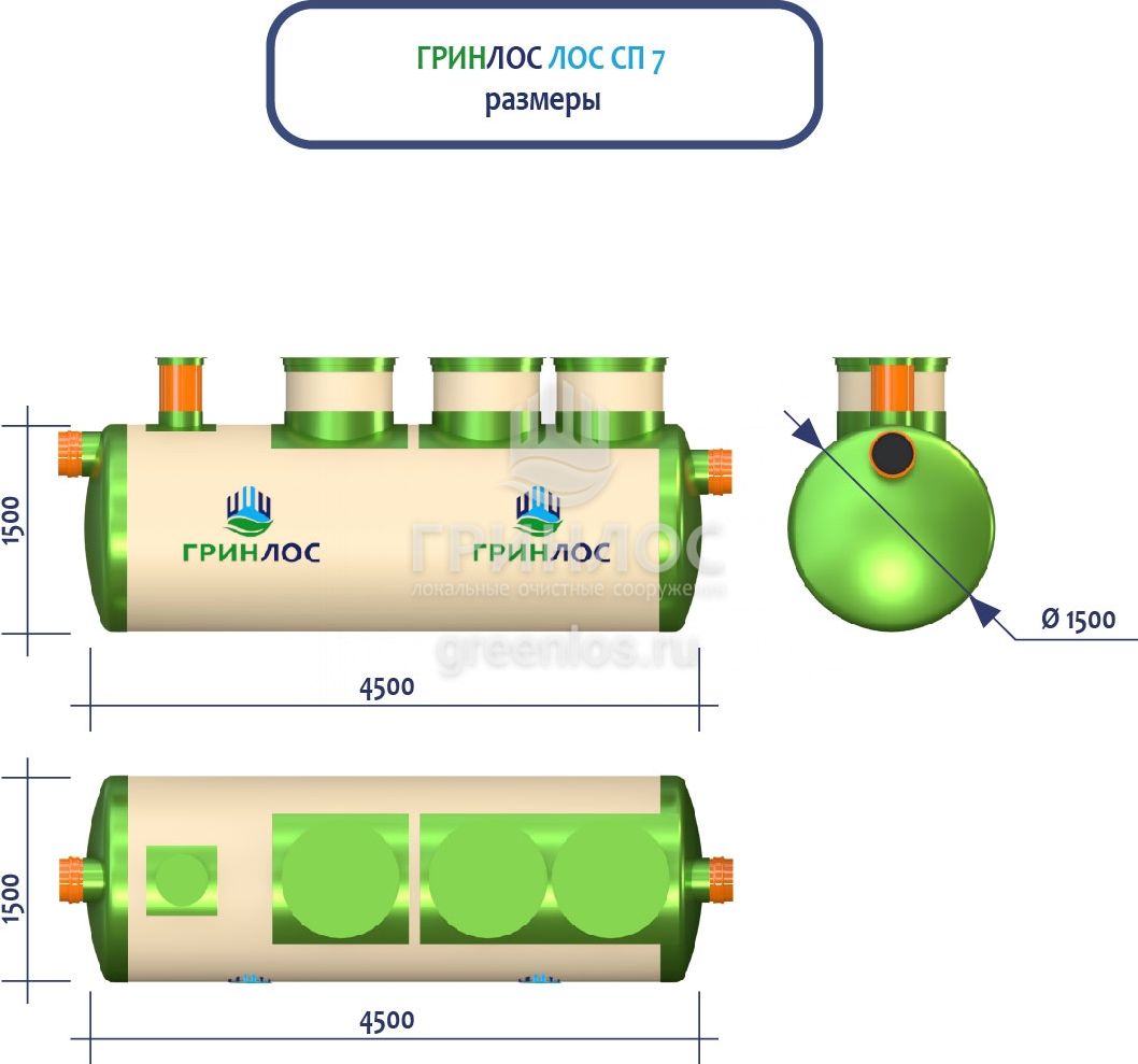 ГРИНЛОС Ливневая канализация 7-1500 стеклопластиковая представляет собой очистное сооружение ливневых стоков габаритами 4500*1500*1500 - 1 корпус. Общий объем корпусов составляет 7.9 м3. Для установки станции потребуется применение вспомогательного оборудования.