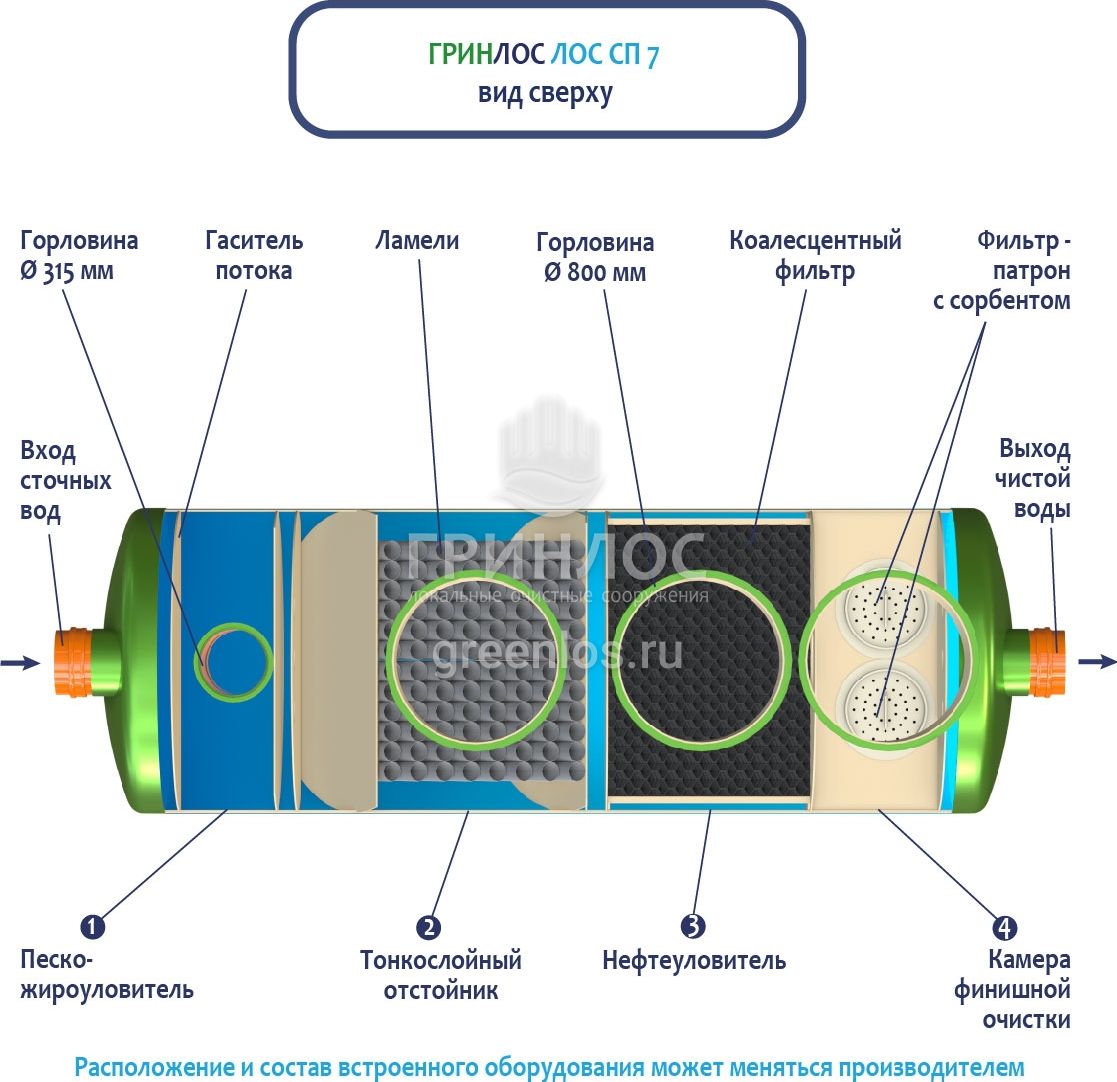 В Ливневой канализации ГРИНЛОС на 7м3 применяется классический принцип очистки дождевых и талых вод, заключающийся в поэтапном прохождении стоков через четыре отсека: