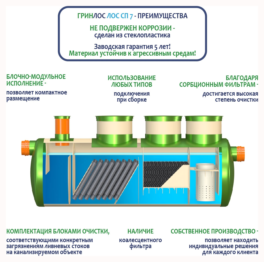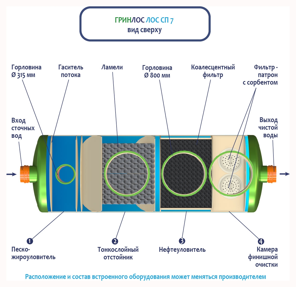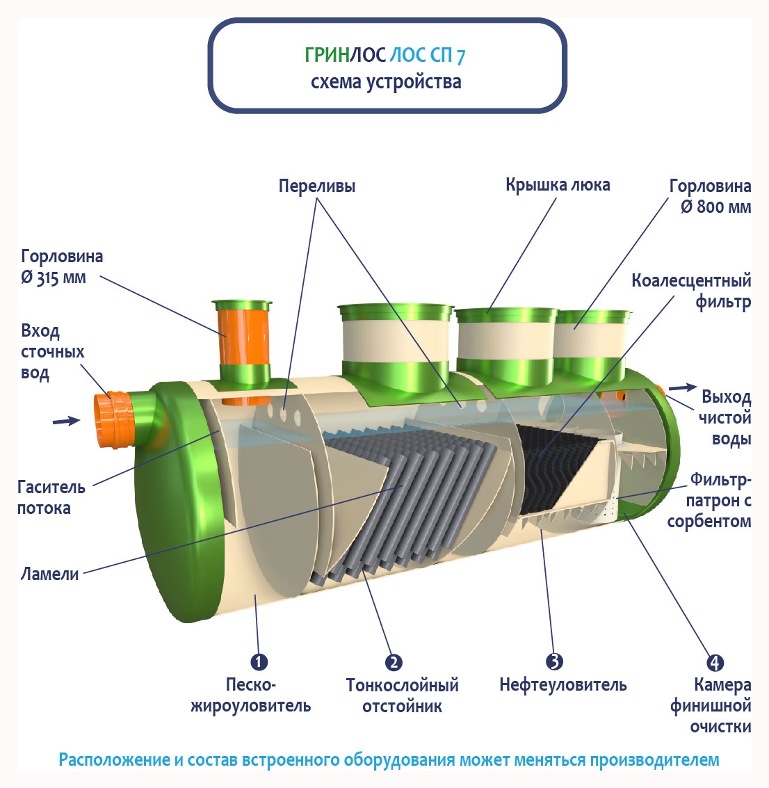 В базовую комплектацию Ливневой канализации Гринлос входит нефтеловушка, которая работает по принципу отстаивания стоков