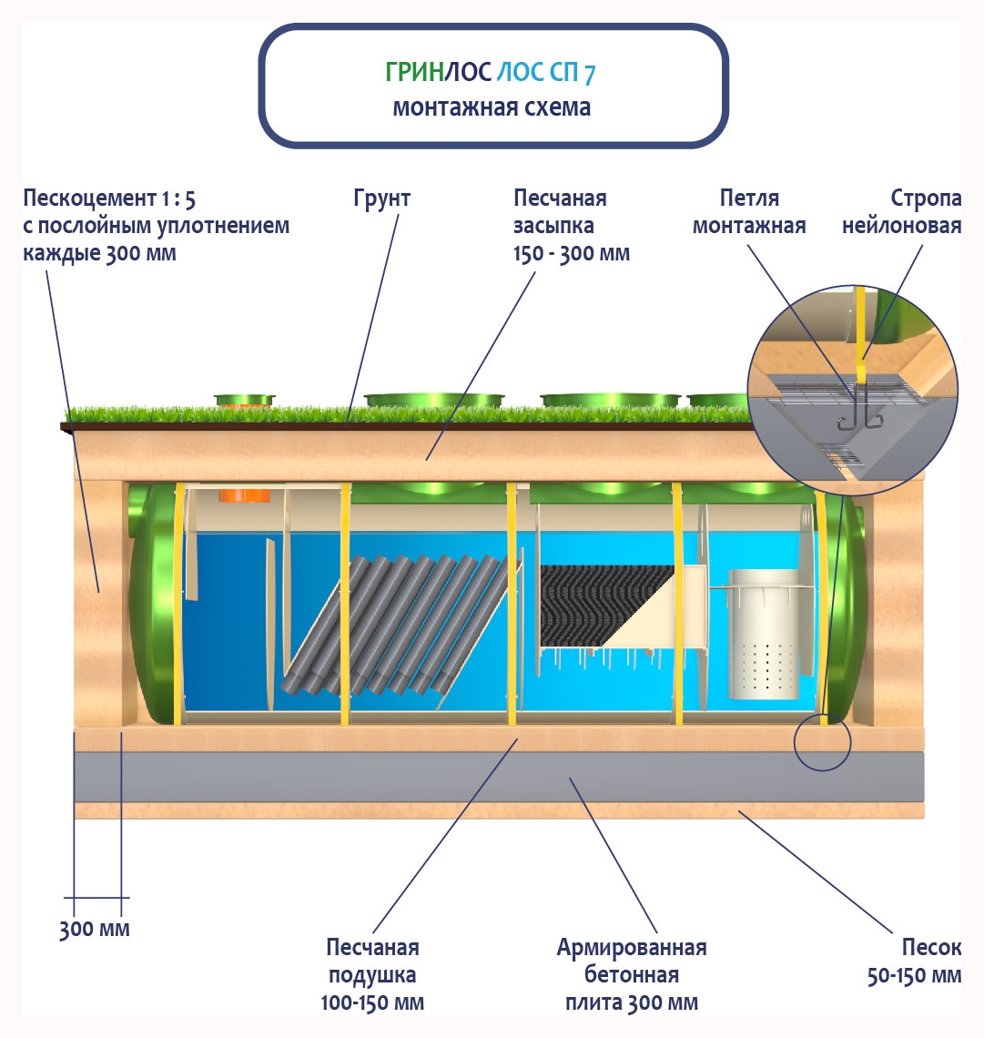 При заглублении ЛОС из стеклопластика на глубину не более 250 мм от верхнего пластикового горизонтального перекрытия до запланированного уровня земли, в однородных грунтах с низким уровнем вод обратную обсыпку допустимо производить песком, смешанным с цементом (марка не ниже М500). Соотношение цемента и песка для обсыпки составляет 1:5. Песчано-цементная засыпка производится послойно, с обязательным трамбованием и проливкой водой каждого слоя. Толщина каждого слоя 300 мм. При условии уровня грунтовых вод выше 1500 мм от уровня земли, при наличии плывуна, скальных грунтов и прочих нестандартных ситуациях, а также в случае заглубления ЛК 7-1500 Сп более чем на 250 мм песчано-цементную смесь необходимо заменить бетоном. Одновременно с засыпкой ливневой канализации, она заполняется водой. Уровень воды должен превышать уровень засыпки (бетонирования) не менее, чем на 200 мм и не более, чем на 500 мм.