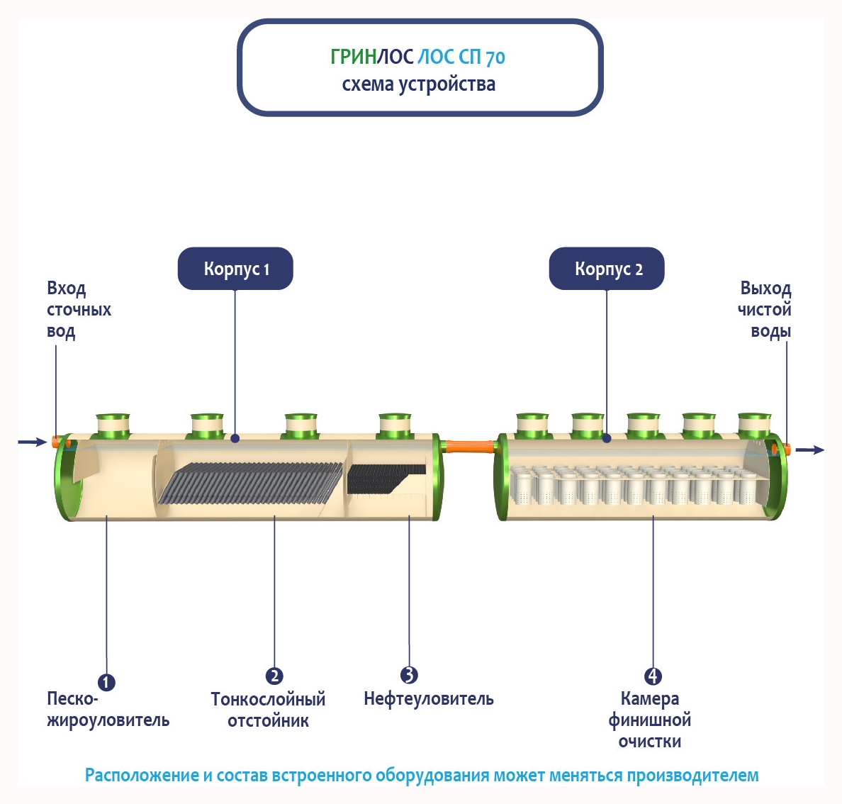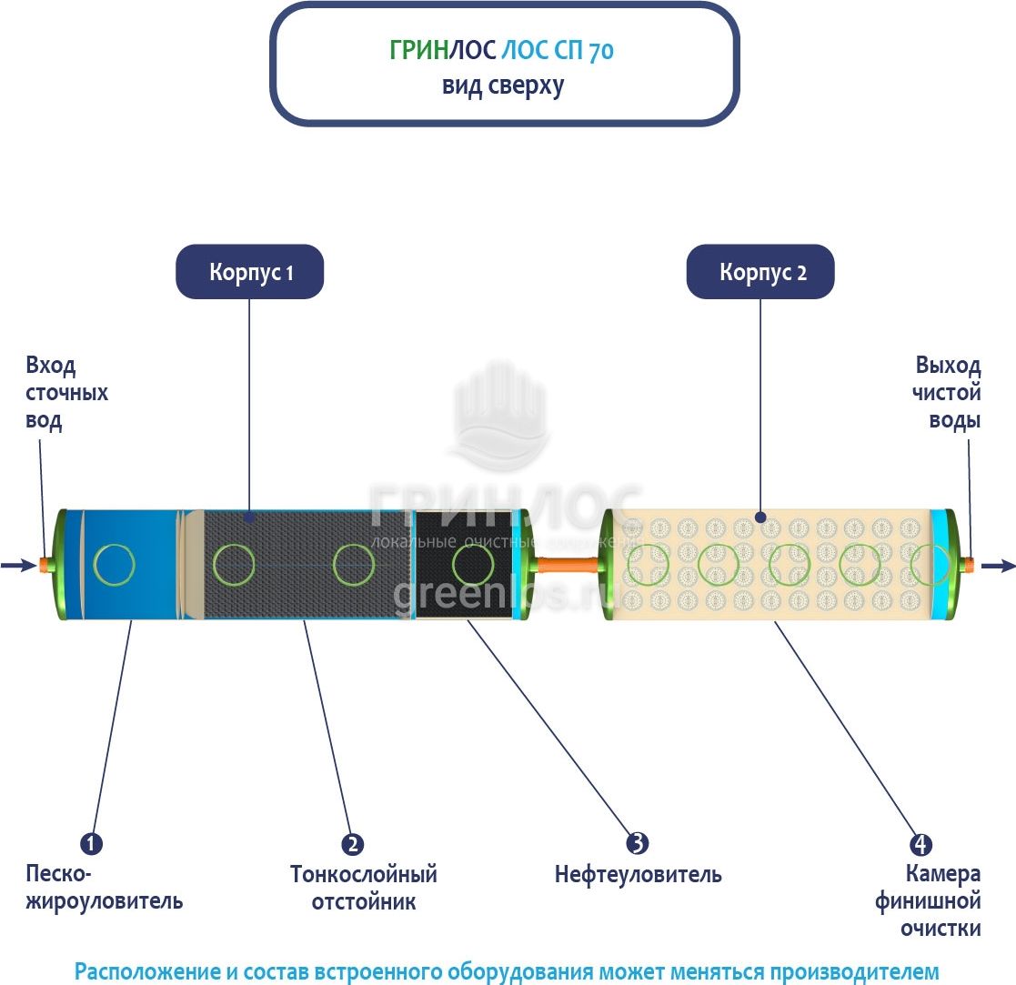 В базовую комплектацию Ливневой канализации Гринлос входит нефтеловушка, которая работает по принципу отстаивания стоков