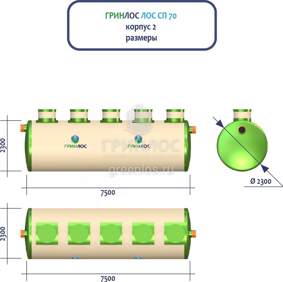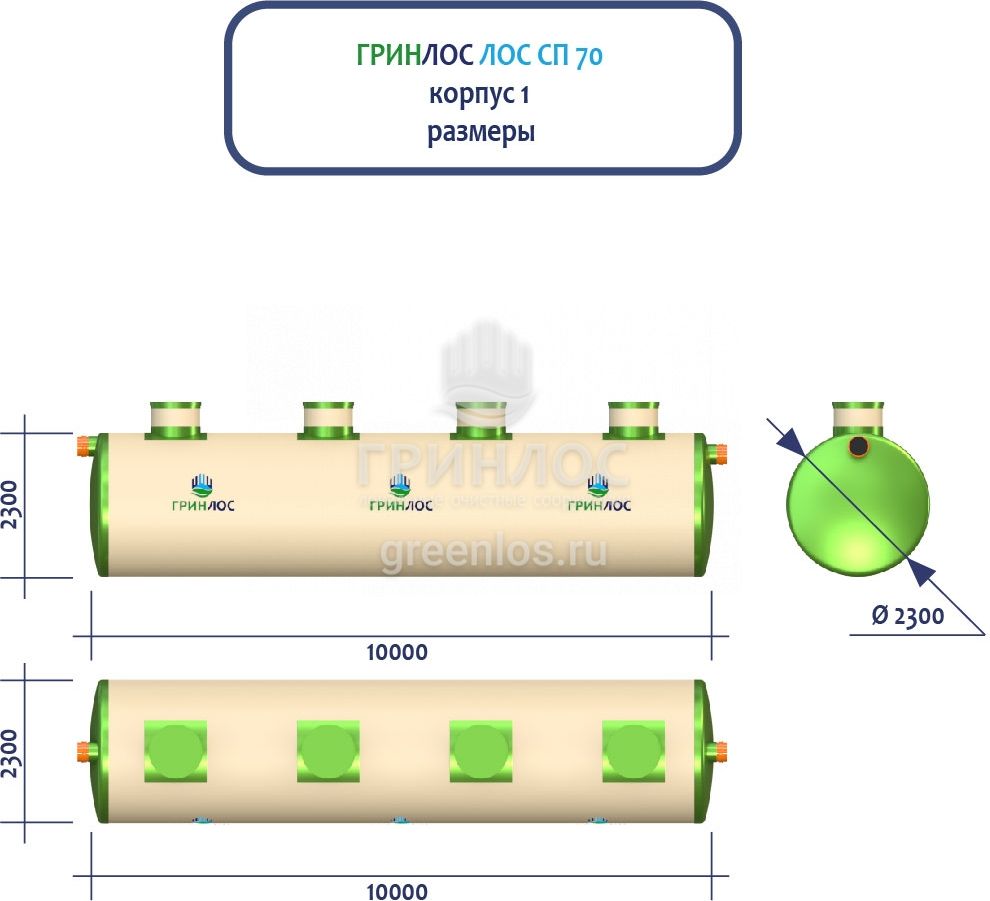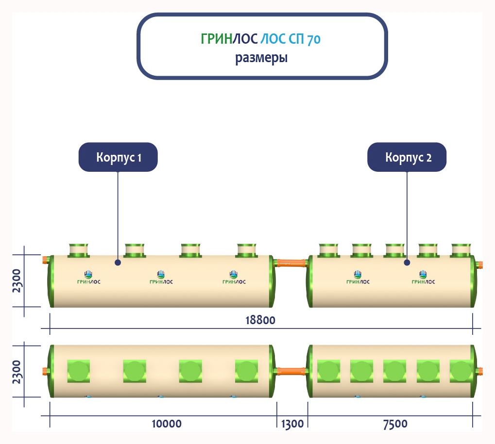 ГРИНЛОС Ливневая канализация 70-2300 стеклопластиковая представляет собой модульное очистное сооружение, состоящее из 2 корпусов размерами 10000*2300*2300 мм - 1 корпус, 7500*2300*2300 мм - 1 корпус. Объем отдельного корпуса 1 вида составляет 41.5 м3, 2 вида – 31.1 м3. Ввиду большого веса, для установки станции потребуется применение вспомогательного оборудования.