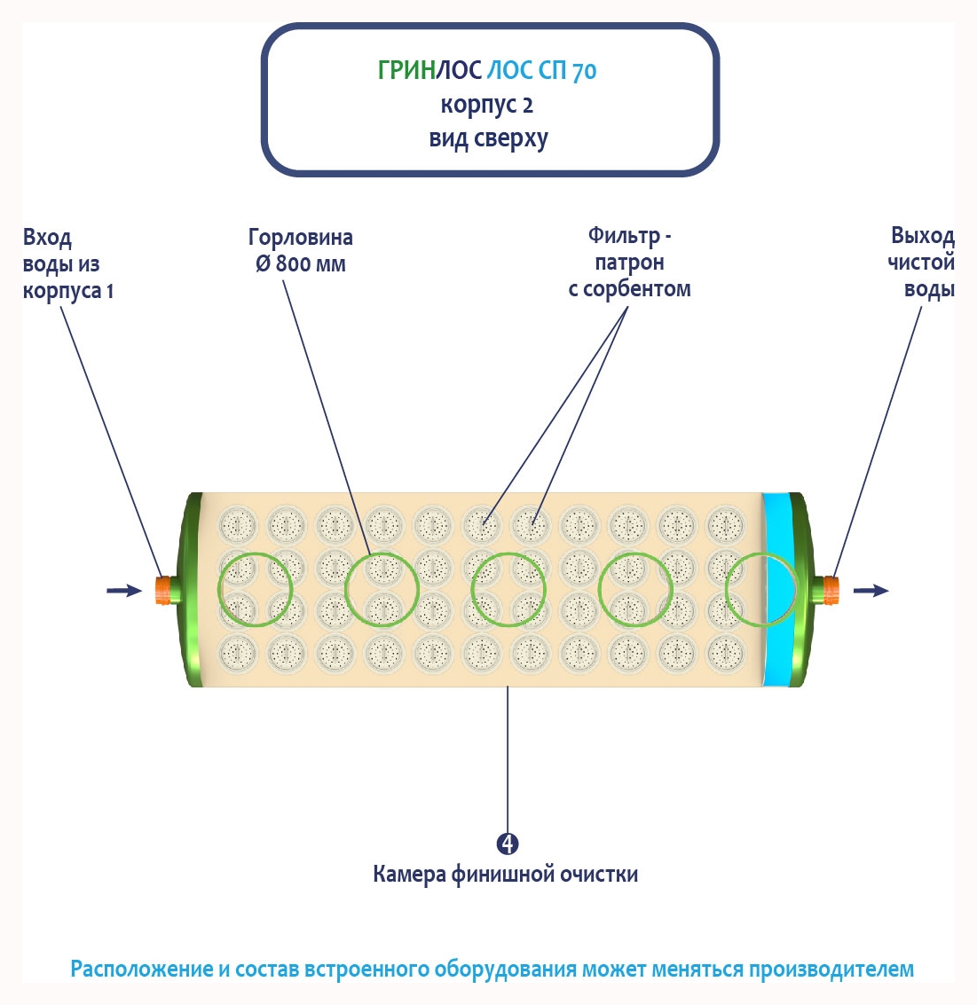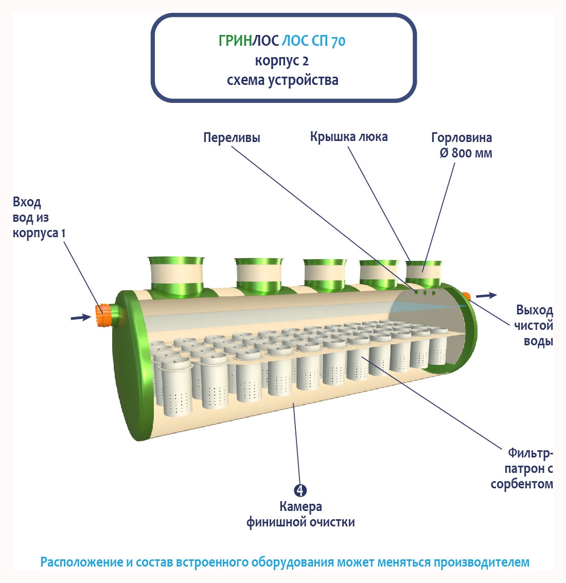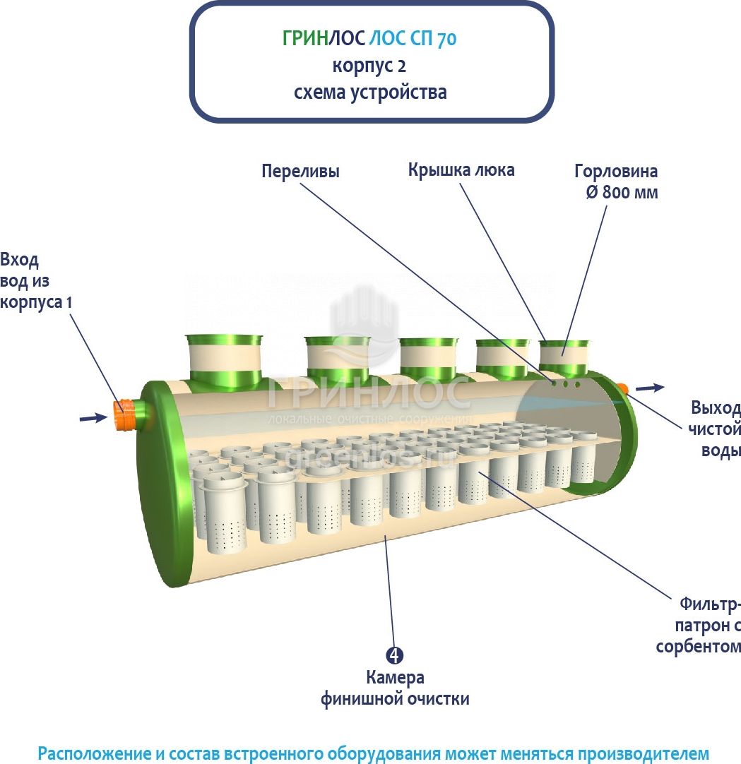 Далее стоки попадают в камеру финишной очистки ливневой канализации ГРИНЛОС Ливневая канализация 70-2300 стеклопластиковая и проходят через фильтр-патрон с сорбентом.