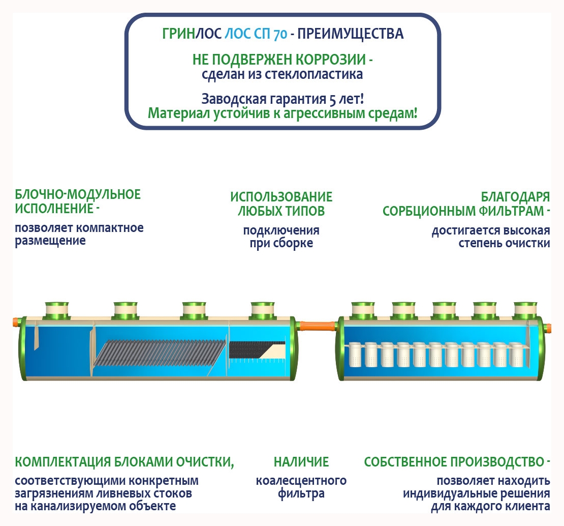 Гринлос ГРИНЛОС Ливневая канализация 70-2300 стеклопластиковая применяется в комплексах ливневой канализации промышленных площадок, торговых центров и АЗС, а также с районов жилой застройки, со складов, мостовых переходов и автодорог. Также находит применение при отведении производственных стоков, процесс очистки которых подразумевает отстаивание и фильтрацию на сорбирующих материалах в виде активированного угля.