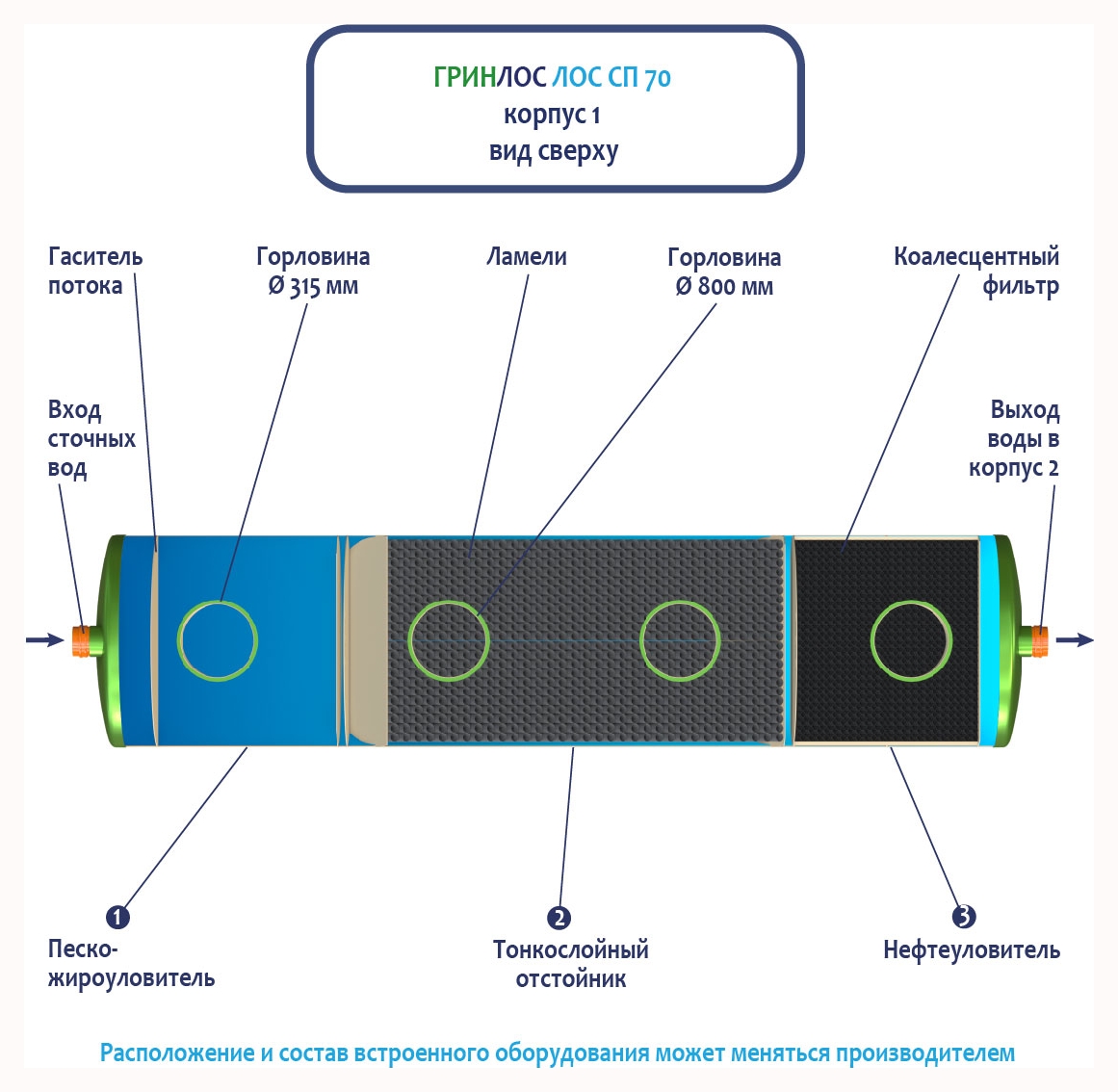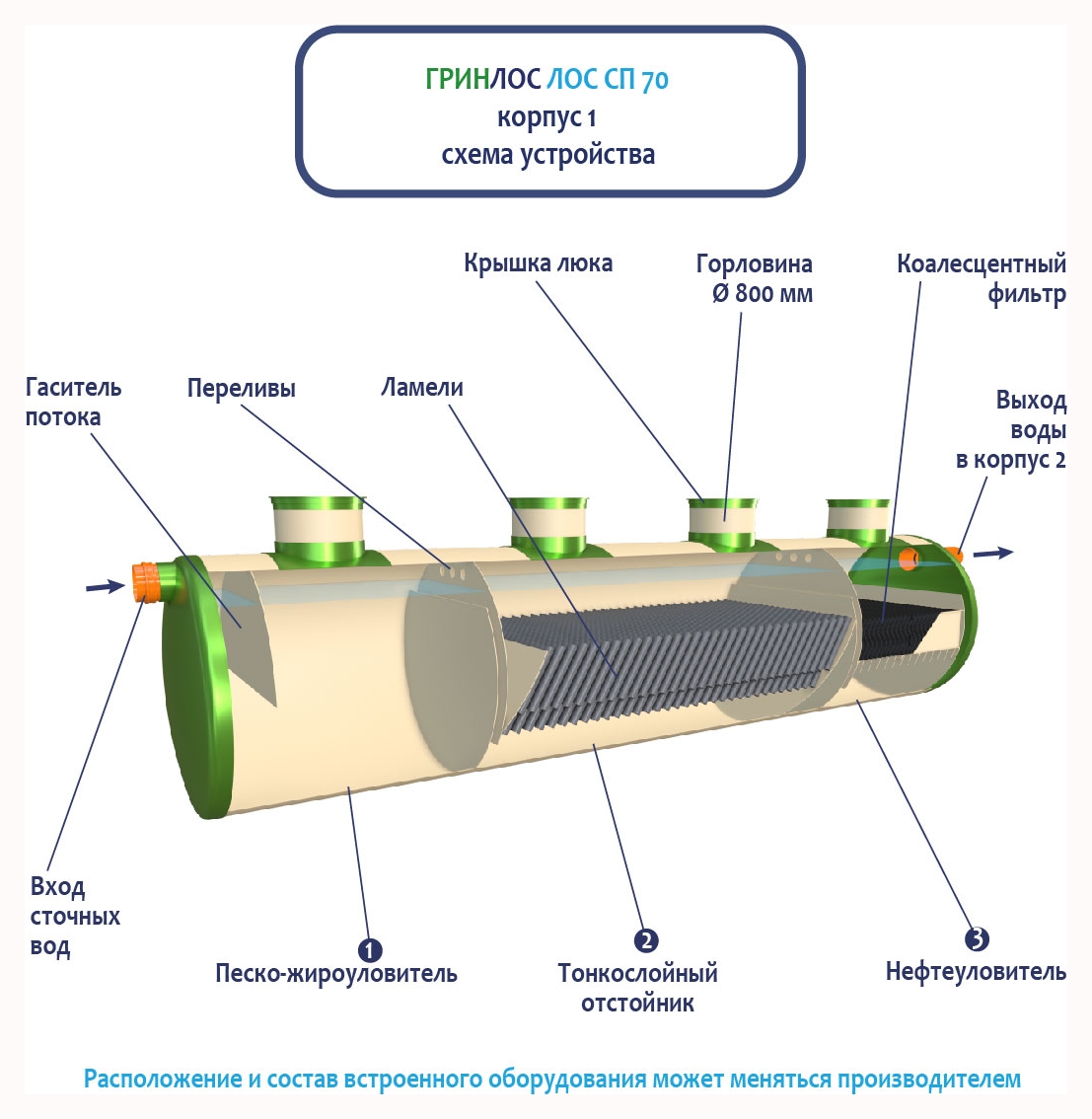 Стоки через входной патрубок корпуса Гринлос ГРИНЛОС Ливневая канализация 70-2300 стеклопластиковая попадают в песко-жироуловитель, где под воздействием седиментации из стоков выделяются взвеси и маслянистые вещества, за счет разницы плотностей твердые частицы оседают на дно, жиры собираются на поверхности.