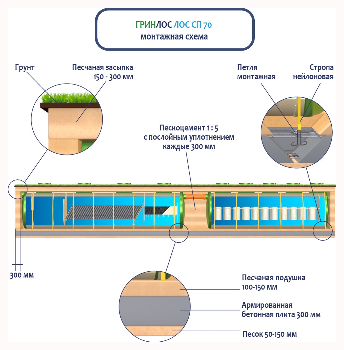 При заглублении ЛОС из стеклопластика на глубину не более 250 мм от верхнего пластикового горизонтального перекрытия до запланированного уровня земли, в однородных грунтах с низким уровнем вод обратную обсыпку допустимо производить песком, смешанным с цементом (марка не ниже М500). Соотношение цемента и песка для обсыпки составляет 1:5. Песчано-цементная засыпка производится послойно, с обязательным трамбованием и проливкой водой каждого слоя. Толщина каждого слоя 300 мм. При условии уровня грунтовых вод выше 1500 мм от уровня земли, при наличии плывуна, скальных грунтов и прочих нестандартных ситуациях, а также в случае заглубления ЛК 70-2300 Сп более чем на 250 мм песчано-цементную смесь необходимо заменить бетоном. Одновременно с засыпкой ливневой канализации, она заполняется водой. Уровень воды должен превышать уровень засыпки (бетонирования) не менее, чем на 200 мм и не более, чем на 500 мм.