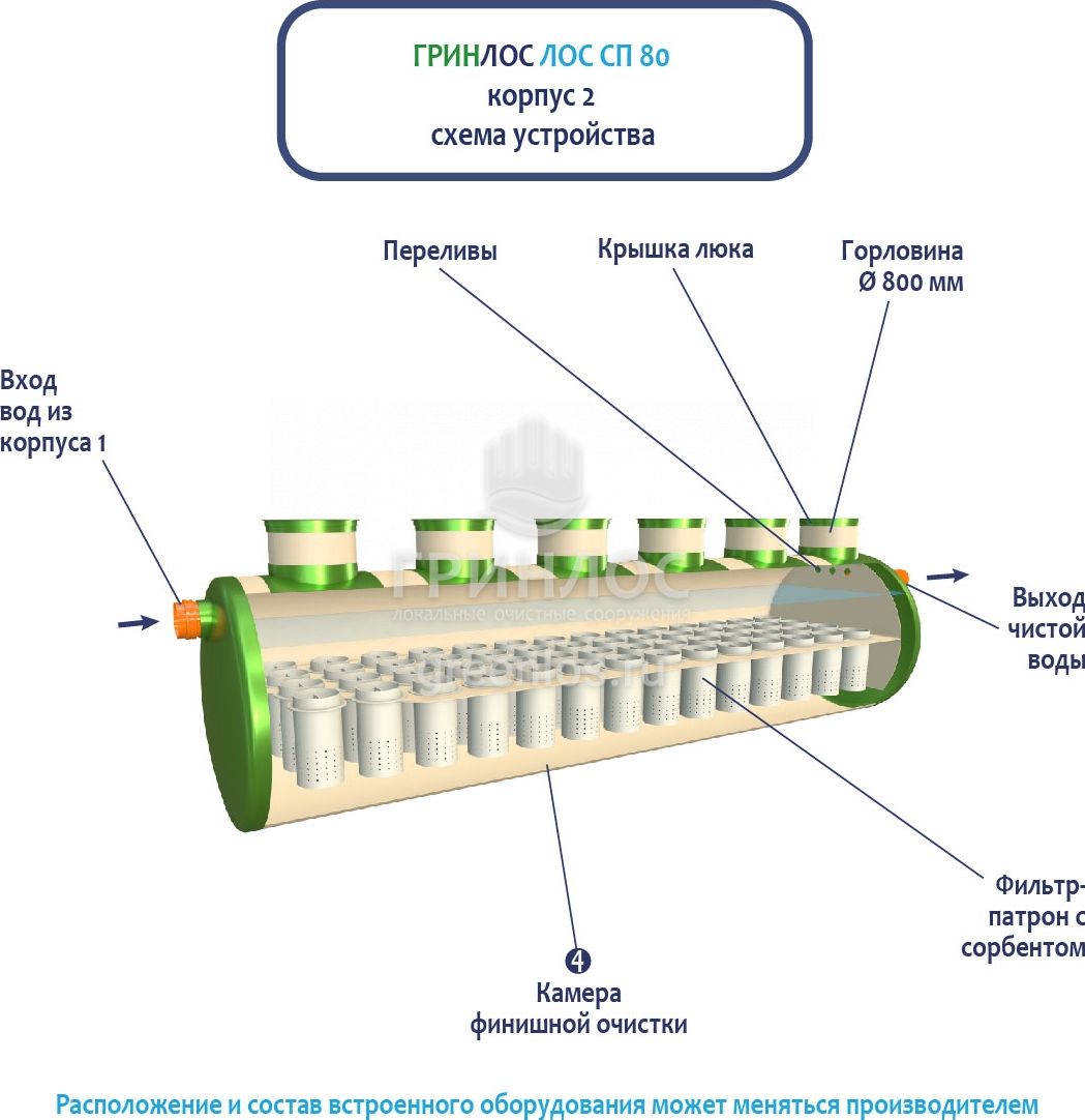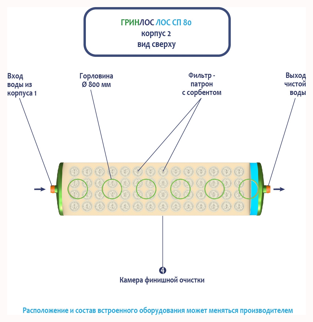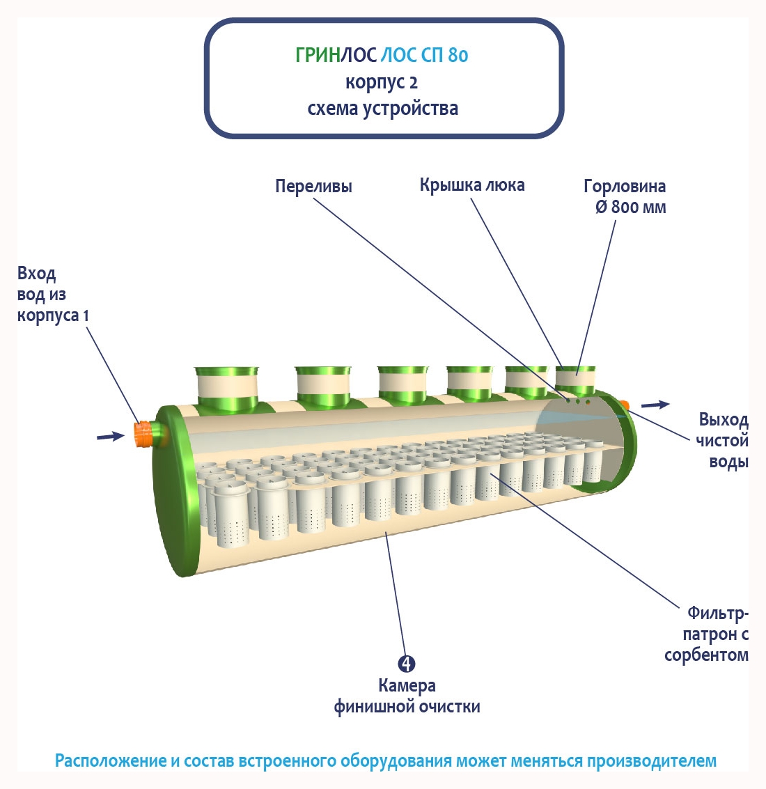 Далее стоки попадают в камеру финишной очистки ливневой канализации ГРИНЛОС Ливневая канализация 80-2300 стеклопластиковая и проходят через фильтр-патрон с сорбентом.