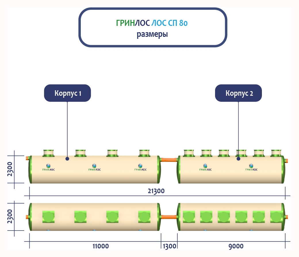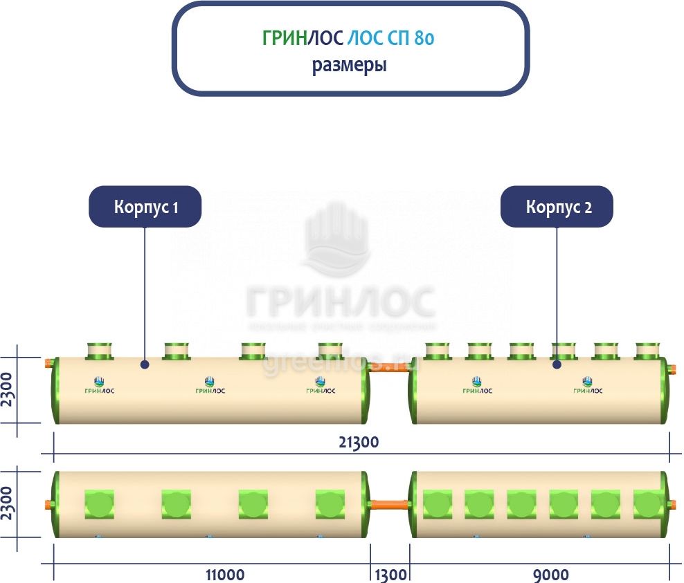 ГРИНЛОС Ливневая канализация 80-2300 стеклопластиковая представляет собой модульное очистное сооружение, состоящее из 2 корпусов размерами 11000*2300*2300 мм - 1 корпус, 9000*2300*2300 мм - 1 корпус. Объем отдельного корпуса 1 вида составляет 45.7 м3, 2 вида – 37.4 м3. Ввиду большого веса, для установки станции потребуется применение вспомогательного оборудования.