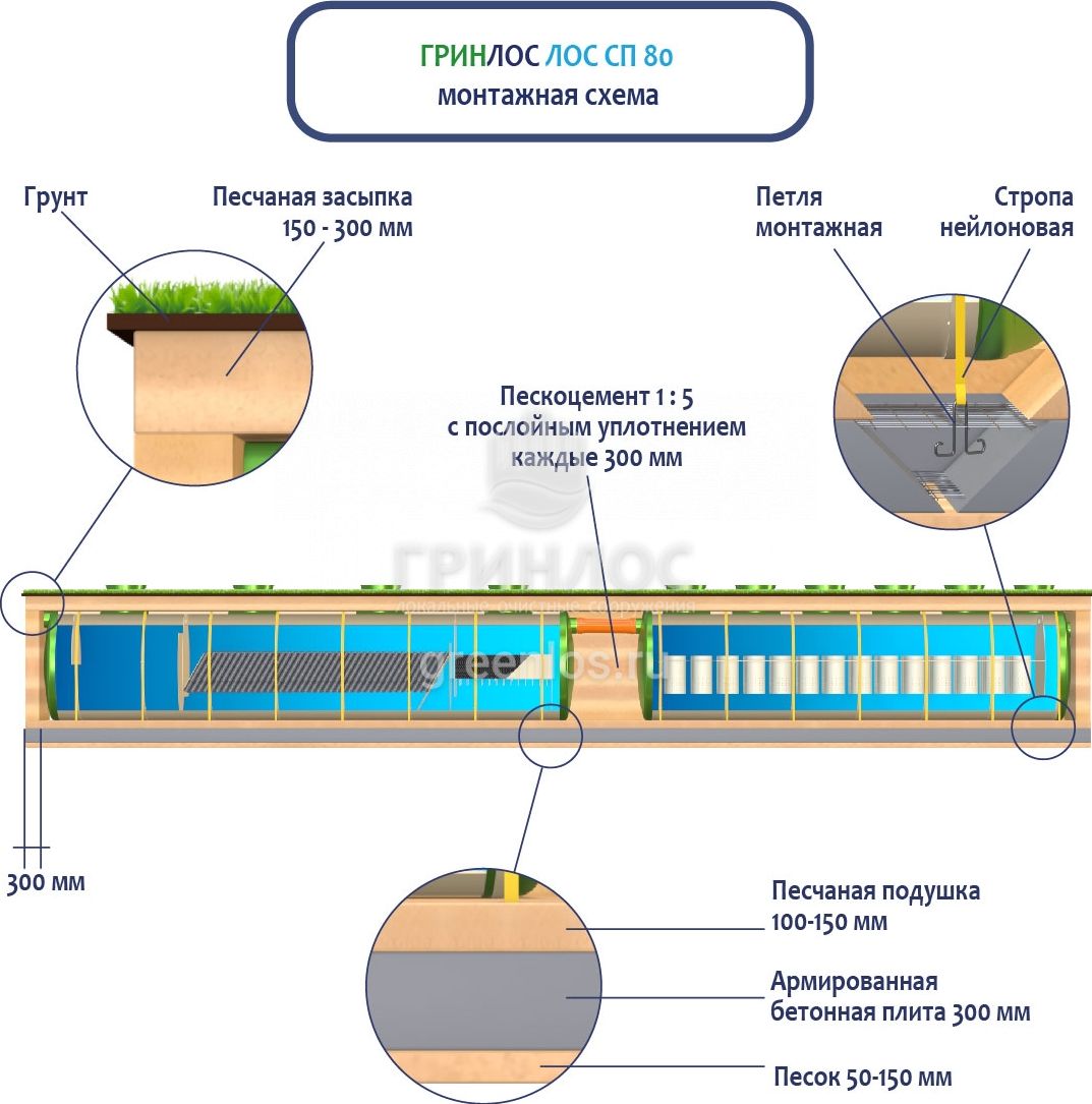 При заглублении ЛОС из стеклопластика на глубину не более 250 мм от верхнего пластикового горизонтального перекрытия до запланированного уровня земли, в однородных грунтах с низким уровнем вод обратную обсыпку допустимо производить песком, смешанным с цементом (марка не ниже М500). Соотношение цемента и песка для обсыпки составляет 1:5. Песчано-цементная засыпка производится послойно, с обязательным трамбованием и проливкой водой каждого слоя. Толщина каждого слоя 300 мм. При условии уровня грунтовых вод выше 1500 мм от уровня земли, при наличии плывуна, скальных грунтов и прочих нестандартных ситуациях, а также в случае заглубления ЛК 80-2300 Сп более чем на 250 мм песчано-цементную смесь необходимо заменить бетоном. Одновременно с засыпкой ливневой канализации, она заполняется водой. Уровень воды должен превышать уровень засыпки (бетонирования) не менее, чем на 200 мм и не более, чем на 500 мм.