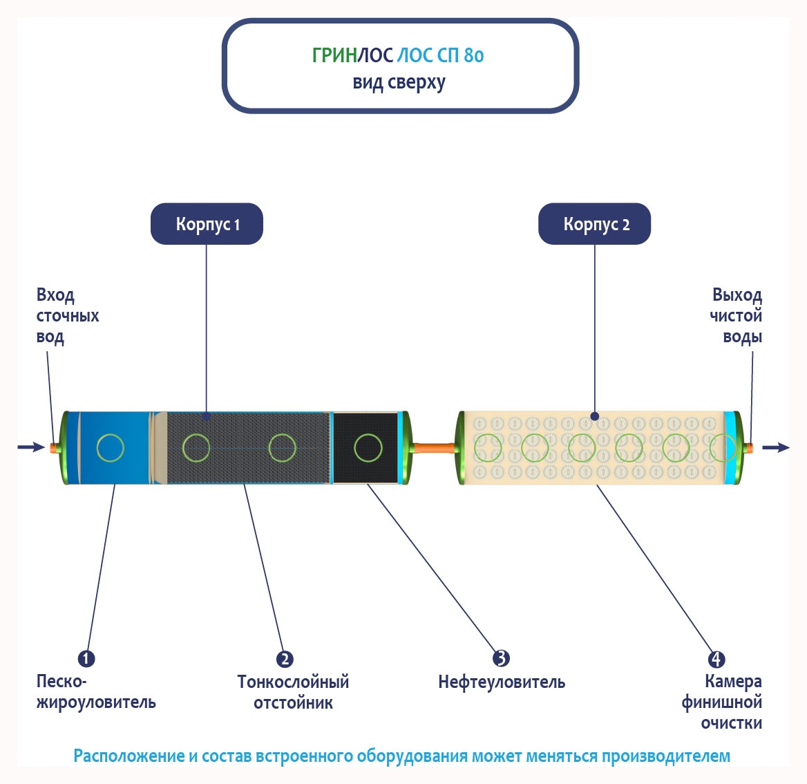 В Ливневой канализации ГРИНЛОС на 80м3 применяется классический принцип очистки дождевых и талых вод, заключающийся в поэтапном прохождении стоков через четыре отсека: