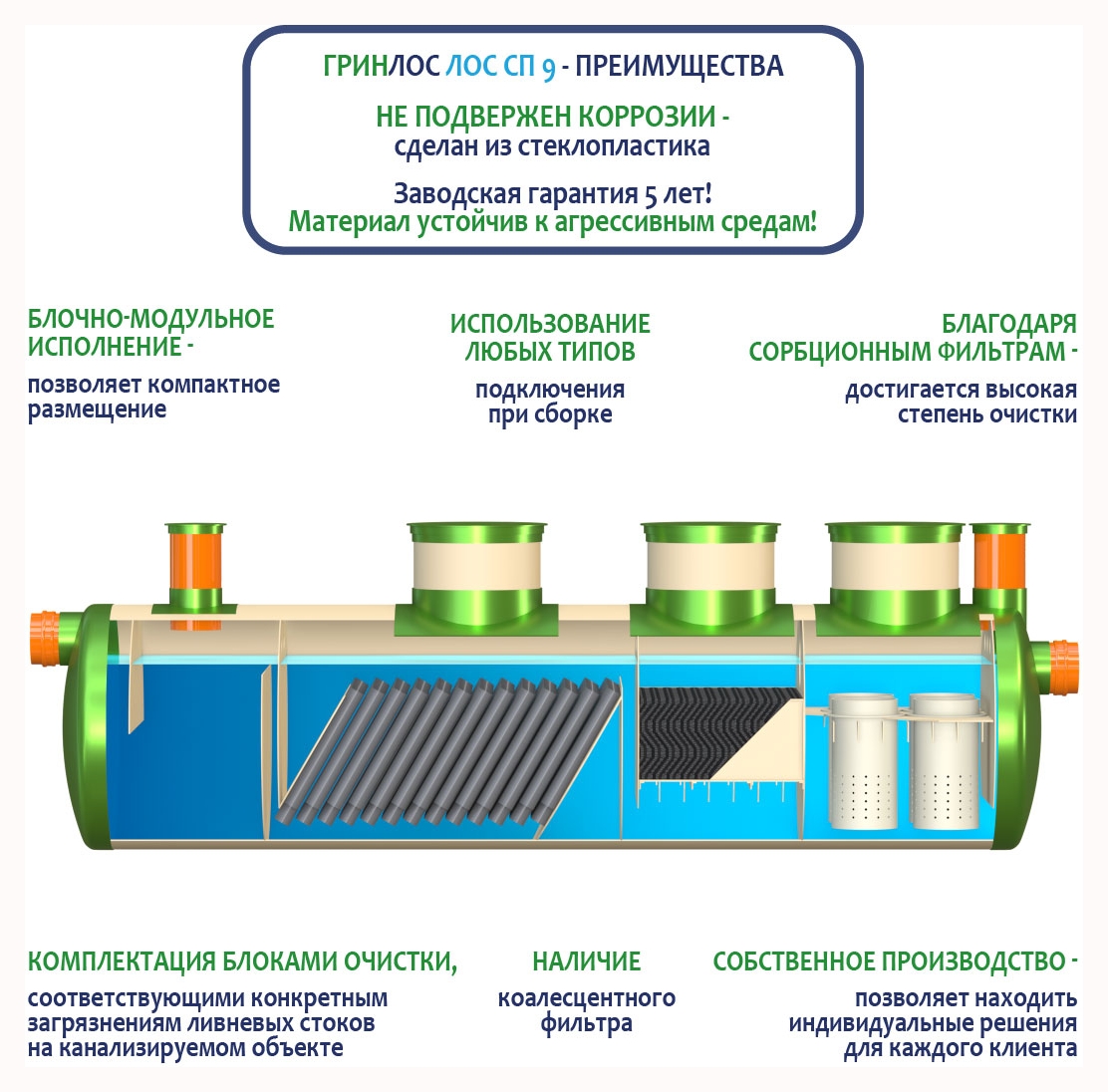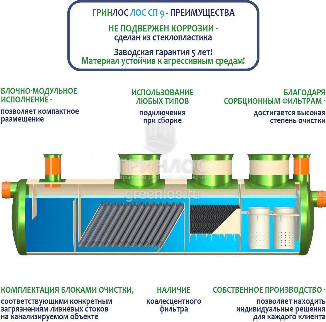 Гринлос ЛК 9-1500 Сп выполнена из стеклопластика – инертного материала, устойчивого к агрессивным средам.