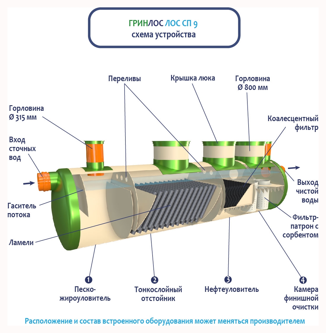 В Ливневой канализации ГРИНЛОС на 9м3 применяется классический принцип очистки дождевых и талых вод, заключающийся в поэтапном прохождении стоков через четыре отсека: