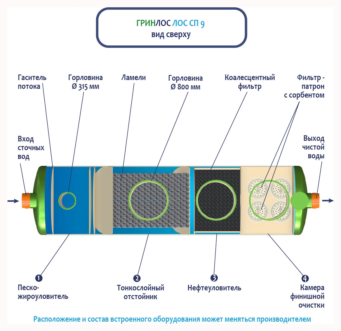 Конструктивно данное сооружение для очистки поверхностных вод представляет собой горизонтальную цилиндрическую ёмкость, разделенную внутри перегородками на отдельные блоки. Остальные блоки являются вертикальными или горизонтальными емкостными сооружениями, имеющими в своем составе перегородки, насосное оборудование, трубопроводы с запорной арматурой и лестницами для обслуживания.