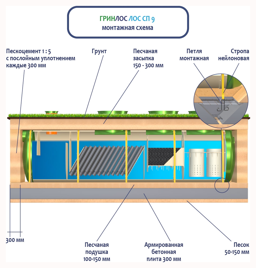 Перед началом работ выполняется входной контроль качества, осмотр оборудования с целью обнаружения дефектов, полученных при транспортировке и хранении, с последующим подписанием акта передачи оборудования в монтаж. Установка стеклопластиковой ливневой канализации ГРИНЛОС Ливневая канализация 9-1500 стеклопластиковая производится монтажным краном, с помощью четырехветвевой стропы. Изделие монтируется строго по уровню. После установки он фиксируется на плите синтетическими стропами за заранее подготовленные монтажные петли в плите.