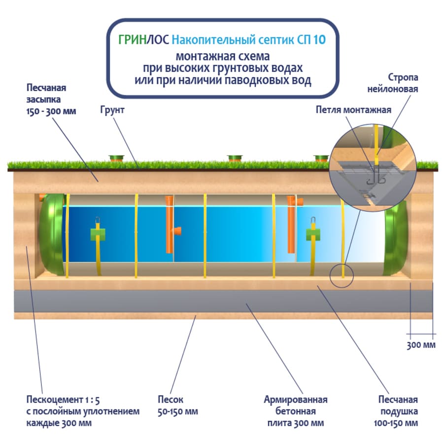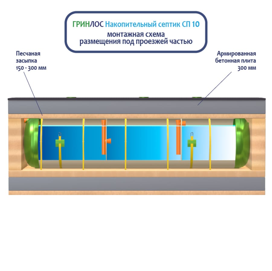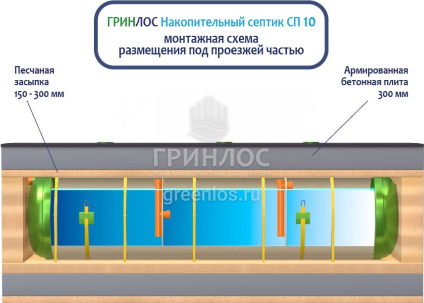 Накопительный Гринлос СП 10 - энергонезависимый септик накопительного типа, поэтому его следует располагать на участке так, чтобы к нему мог беспрепятственно подъехать ассенизационный автомобиль. Над местом установки Накопительного септика СП 10 не допускается движение и стоянка автотранспорта в радиусе 2,5 м. В случае необходимости проезда автотранспорта или организации стоянки, над очистным сооружением и над подводящей и отводящей трассами следует оборудовать разгрузочную плиту.