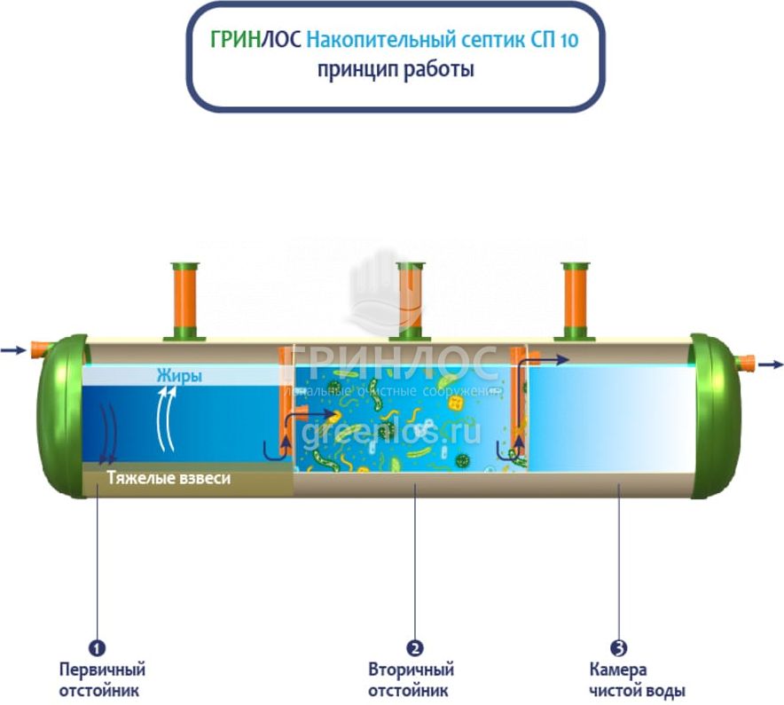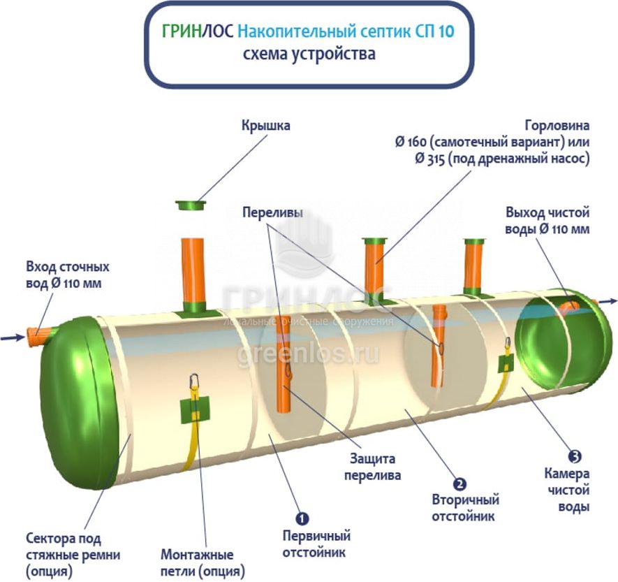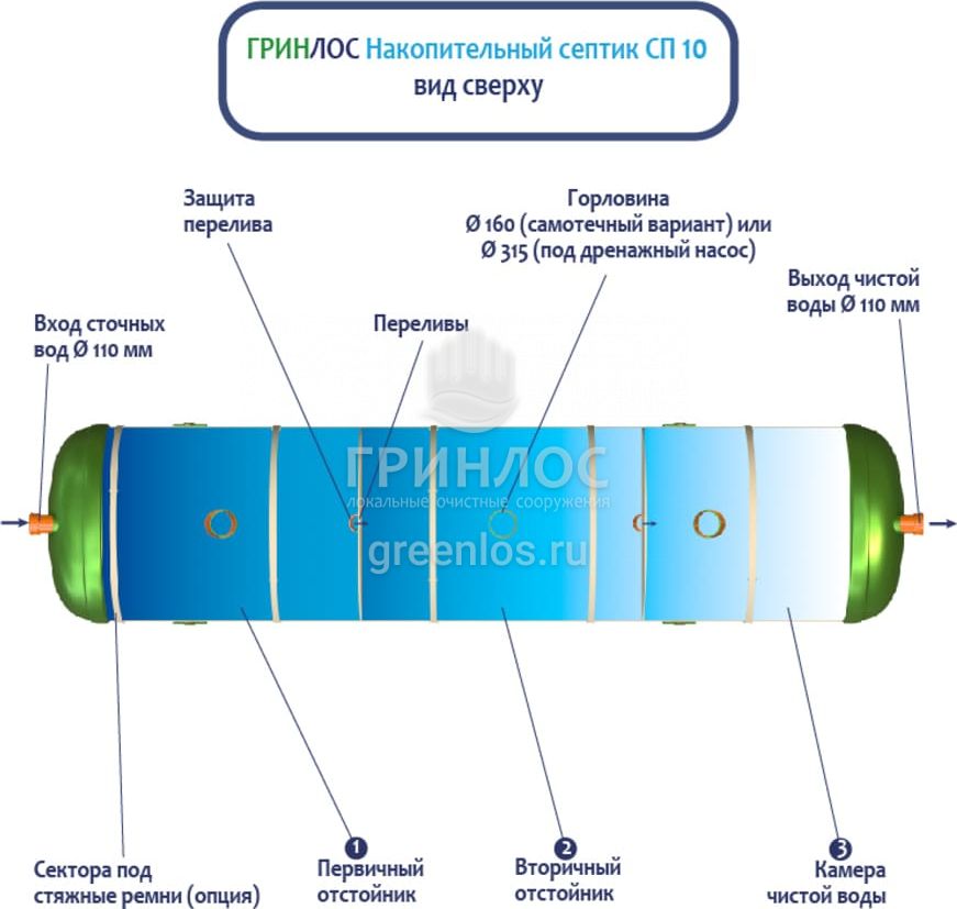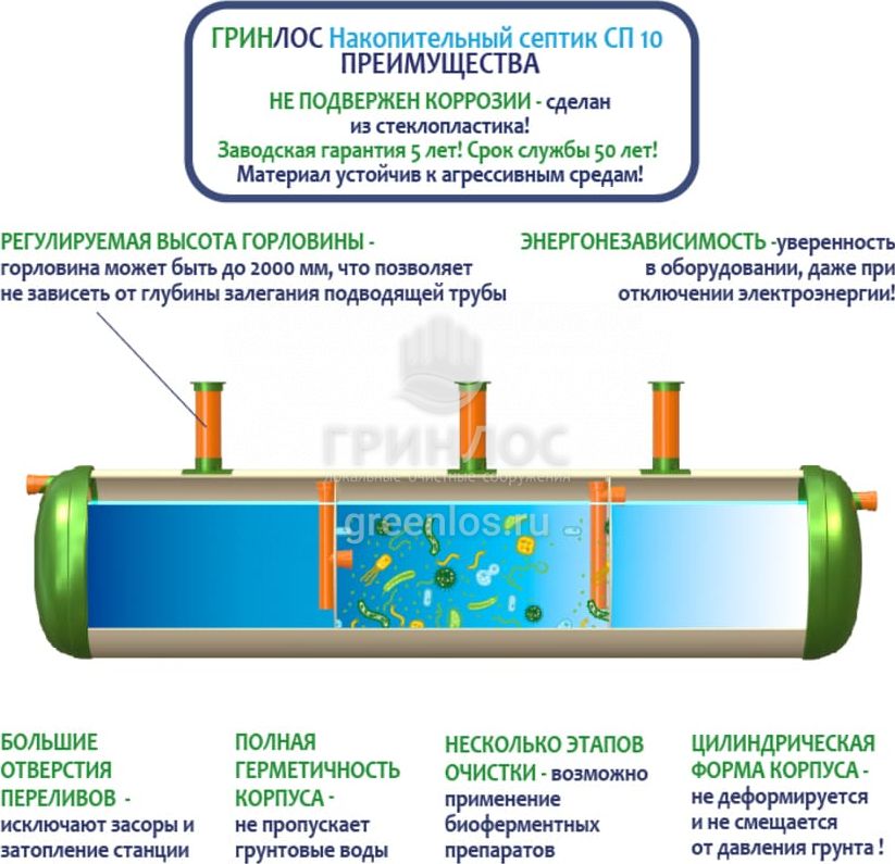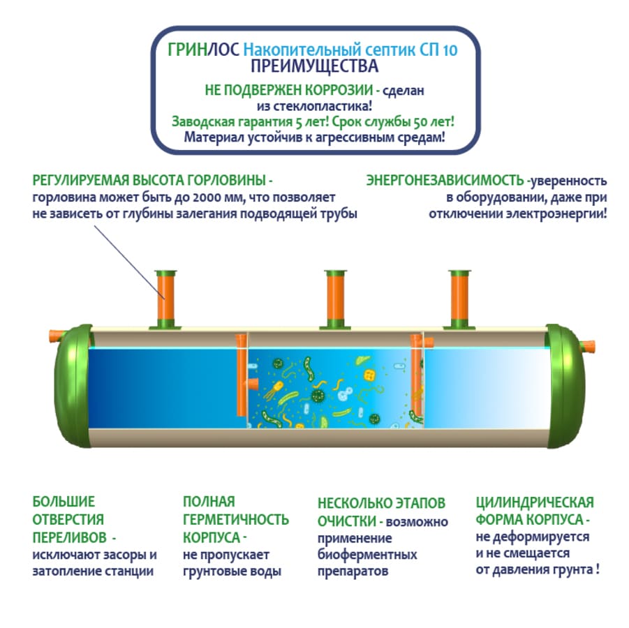 Конструкция Накопительный Гринлос СП 10 представляет собой цилиндр, выполненный из стеклопластика. Внутри цилиндр с помощью перегородок разделен на камеры, сообщающиеся между собой через отверстия для перелива.
