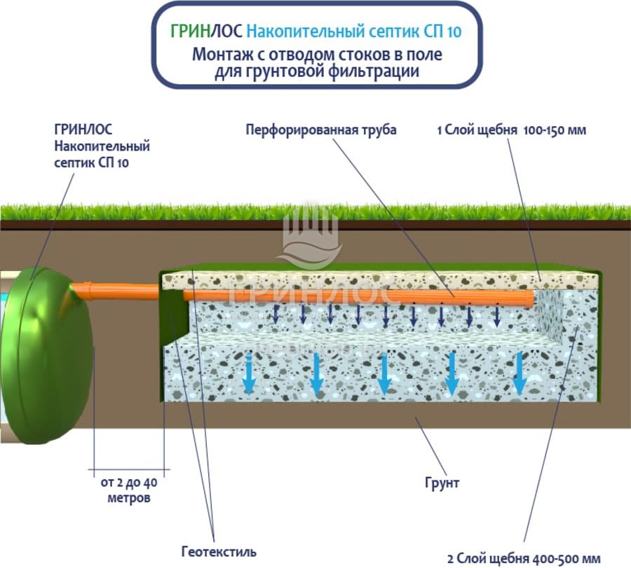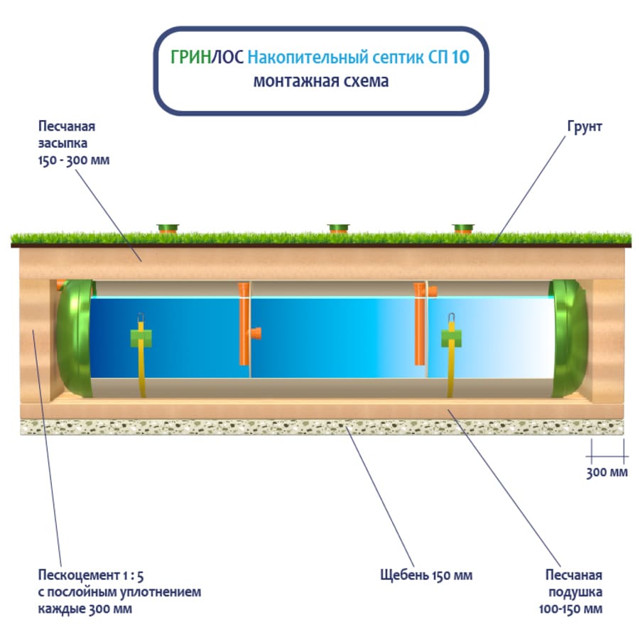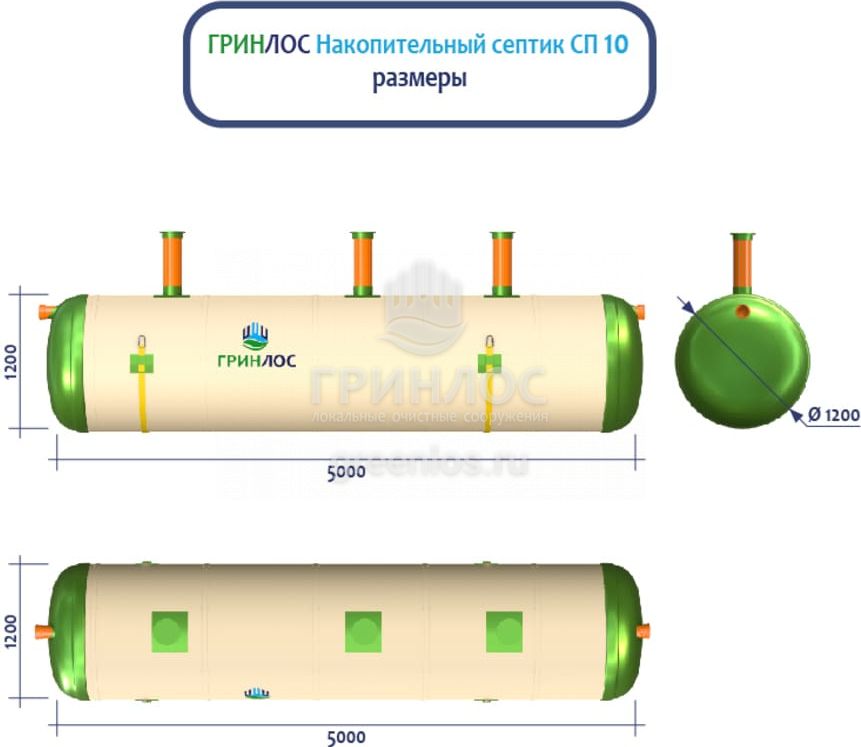 Накопительный септик ГРИНЛОС СП 10 — это энергонезависимый септик с залповым сбросом 400 л и производительностью 2 м3/сутки, что делает его подходящим для домов, в которых число жильцов не превышает 10 условных пользователей.