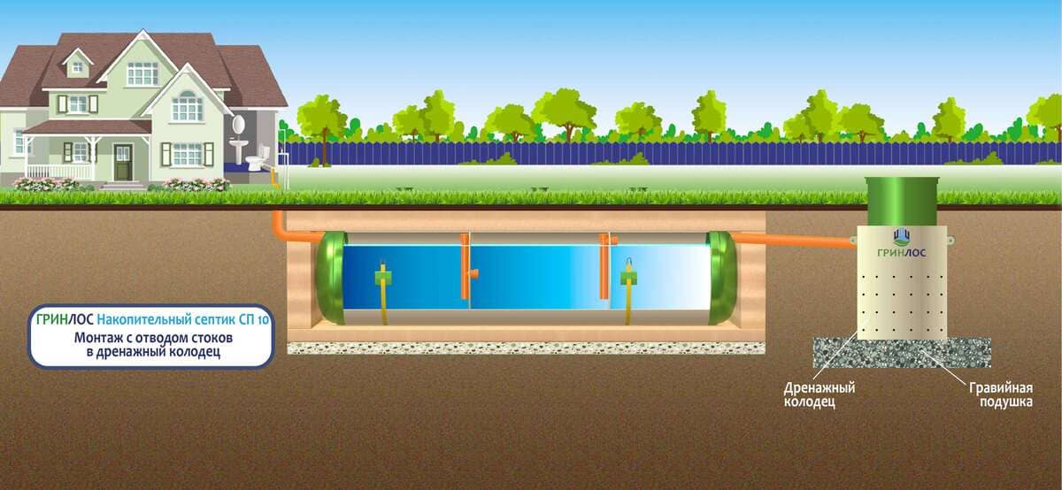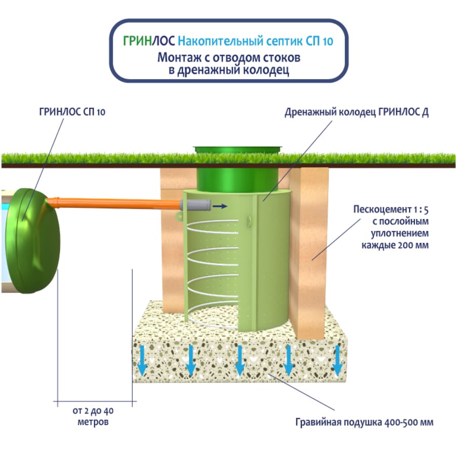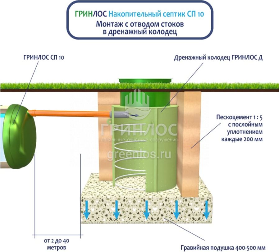 Монтаж с отводом очищенных сточных вод в дренажный колодец. Подходит для хорошо поглощающих грунтов (песок, супесь) и низком уровне грунтовых вод. Колодец поглощения может быть выполнен из бетонных колец или при помощи пластикового колодца с перфорированным основанием и стенками. При монтаже колодца поглощения на выпуск трубы рекомендуется смонтировать обратный клапан для защиты Накопительного септика Гринлос СП 10 от обратного затопления в периоды активного снеготаяния или в дождливое межсезонье. Непосредственно под выпуском отводящей трубы от септика рекомендуется смонтировать аварийный насос для дополнительной защиты Накопительный Гринлос СП 10 от обратного затопления из колодца поглощения.
