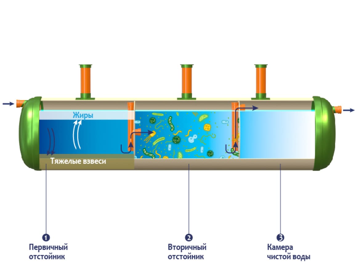 По канализационной трубе от дома сточные воды поступают в первый бак или отсек (первичный отстойник).