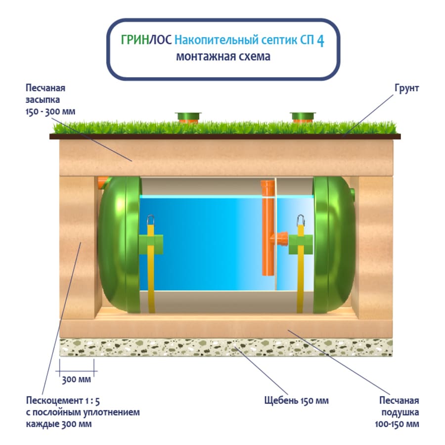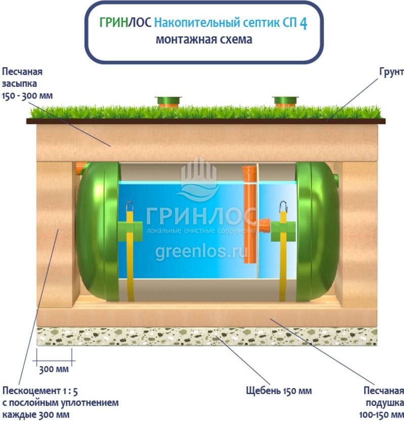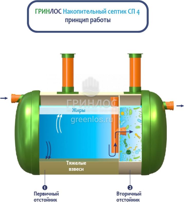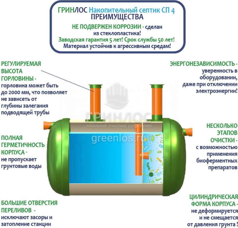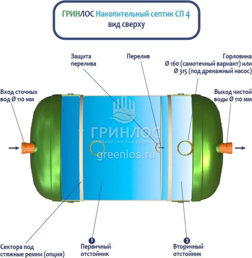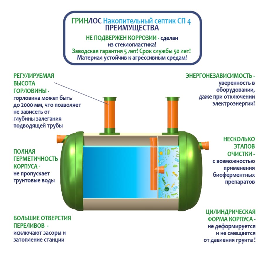 Конструкция Накопительный Гринлос СП 4 представляет собой цилиндр, выполненный из стеклопластика. Внутри цилиндр с помощью перегородок разделен на камеры, сообщающиеся между собой через отверстия для перелива.