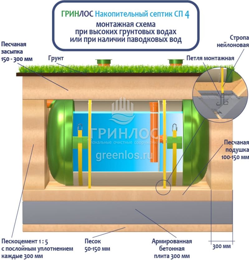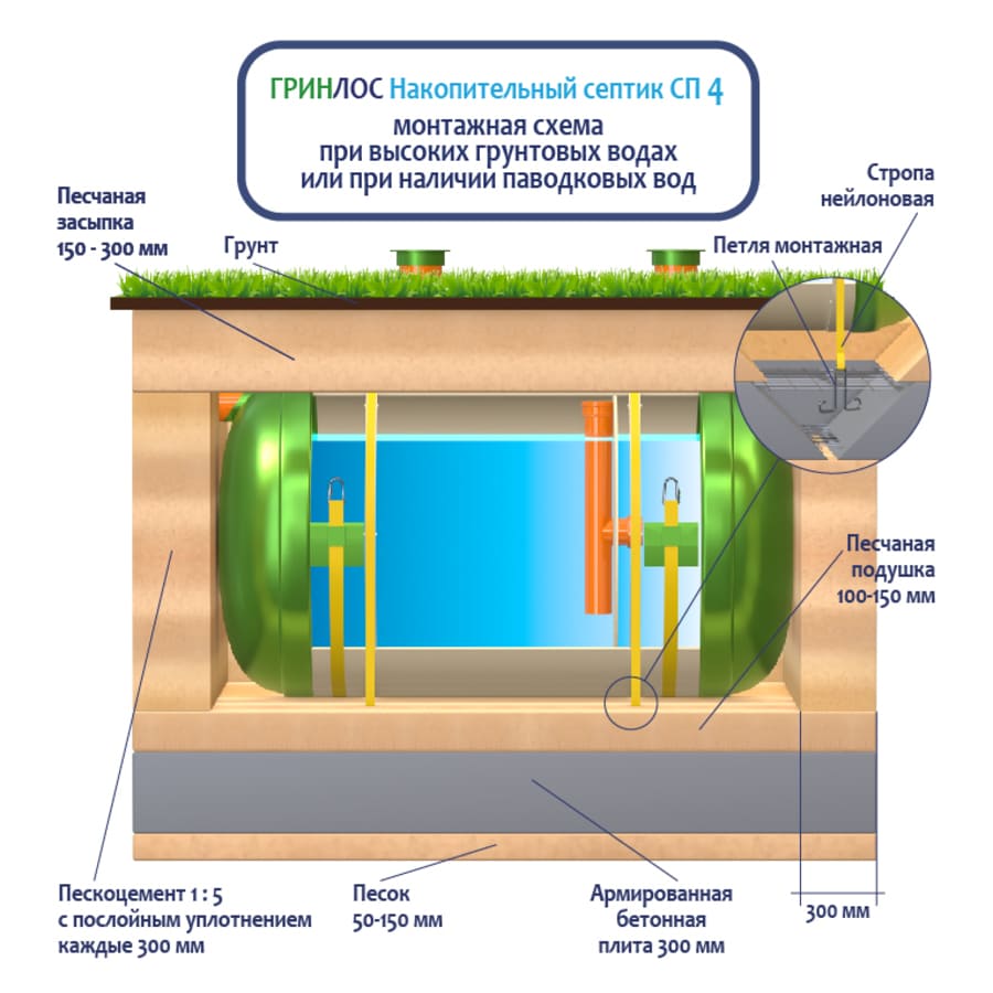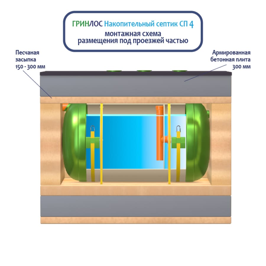 Накопительный Гринлос СП 4 - энергонезависимый септик накопительного типа, поэтому его следует располагать на участке так, чтобы к нему мог беспрепятственно подъехать ассенизационный автомобиль. Над местом установки Накопительного септика СП 4 не допускается движение и стоянка автотранспорта в радиусе 2,5 м. В случае необходимости проезда автотранспорта или организации стоянки, над очистным сооружением и над подводящей и отводящей трассами следует оборудовать разгрузочную плиту.