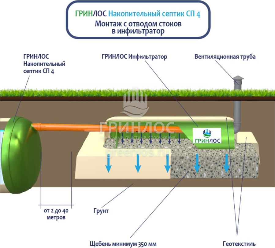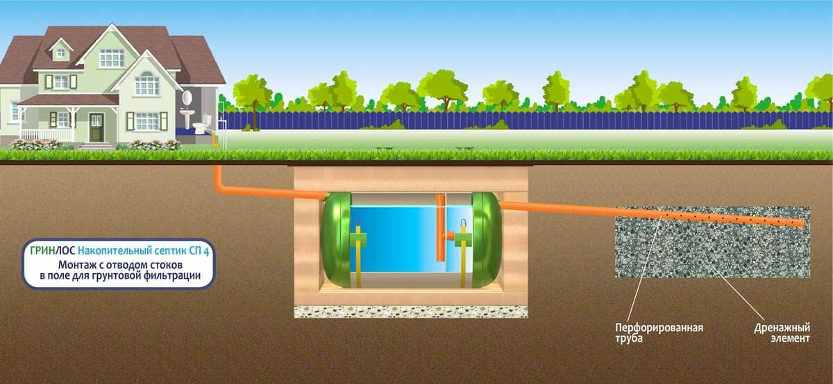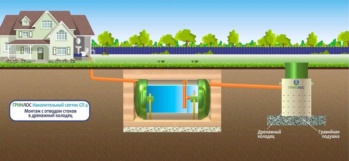 Монтаж с отводом очищенных сточных вод в дренажный колодец. Подходит для хорошо поглощающих грунтов (песок, супесь) и низком уровне грунтовых вод. Колодец поглощения может быть выполнен из бетонных колец или при помощи пластикового колодца с перфорированным основанием и стенками. При монтаже колодца поглощения на выпуск трубы рекомендуется смонтировать обратный клапан для защиты Накопительного септика Гринлос СП 4 от обратного затопления в периоды активного снеготаяния или в дождливое межсезонье. Непосредственно под выпуском отводящей трубы от септика рекомендуется смонтировать аварийный насос для дополнительной защиты Накопительный Гринлос СП 4 от обратного затопления из колодца поглощения.