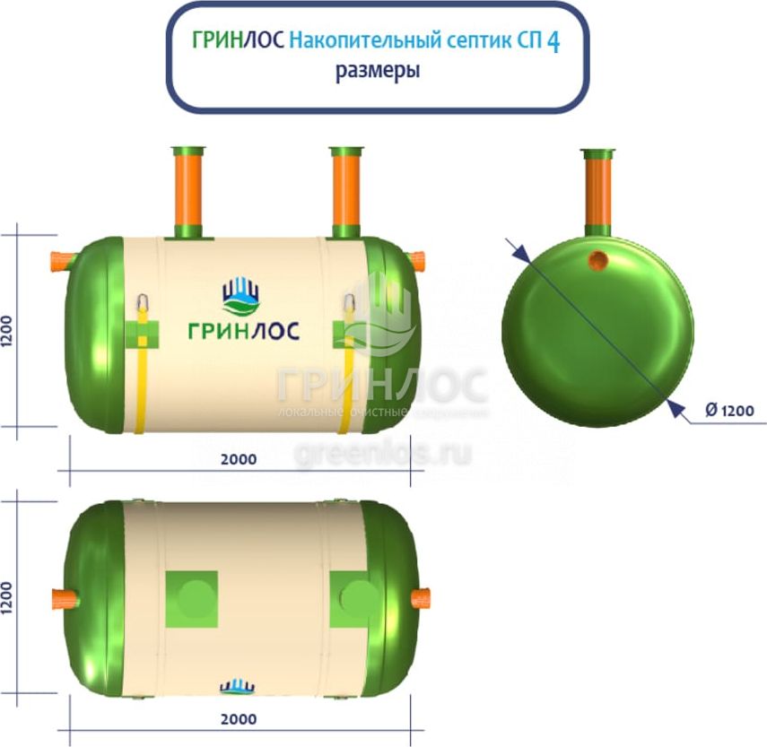 Накопительный септик ГРИНЛОС СП 4 — это энергонезависимый септик с залповым сбросом 200 л и производительностью 0.8 м3/сутки, что делает его подходящим для домов, в которых число жильцов не превышает 4 условных пользователей.