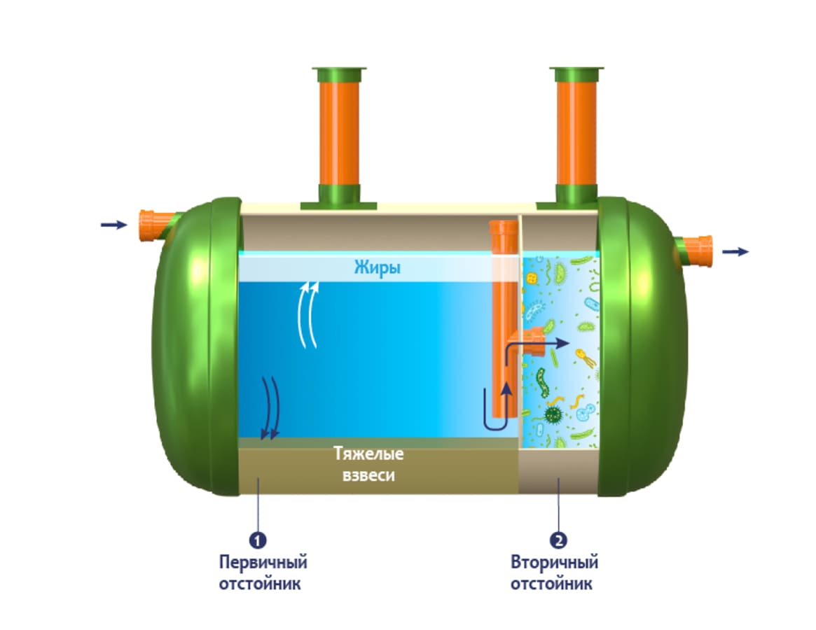 По канализационной трубе от дома сточные воды поступают в первый бак или отсек (первичный отстойник).