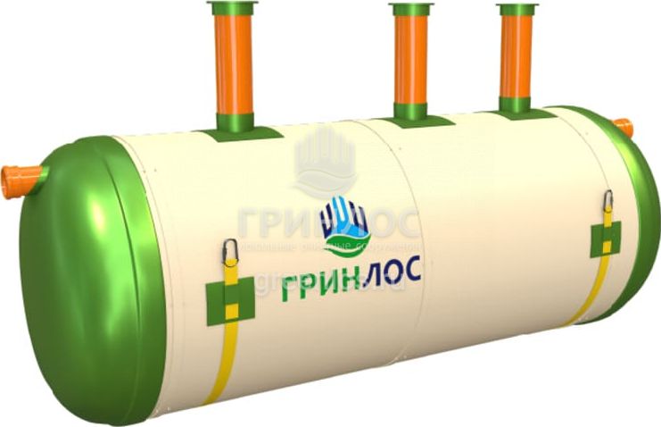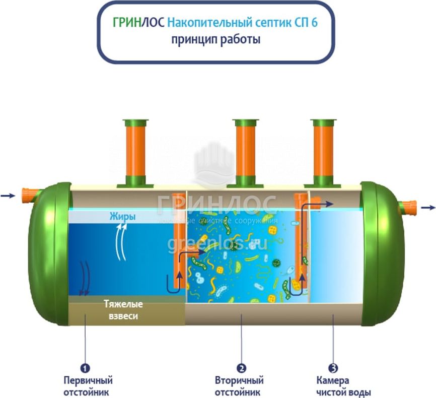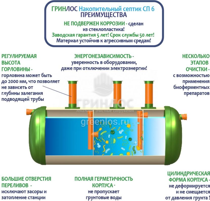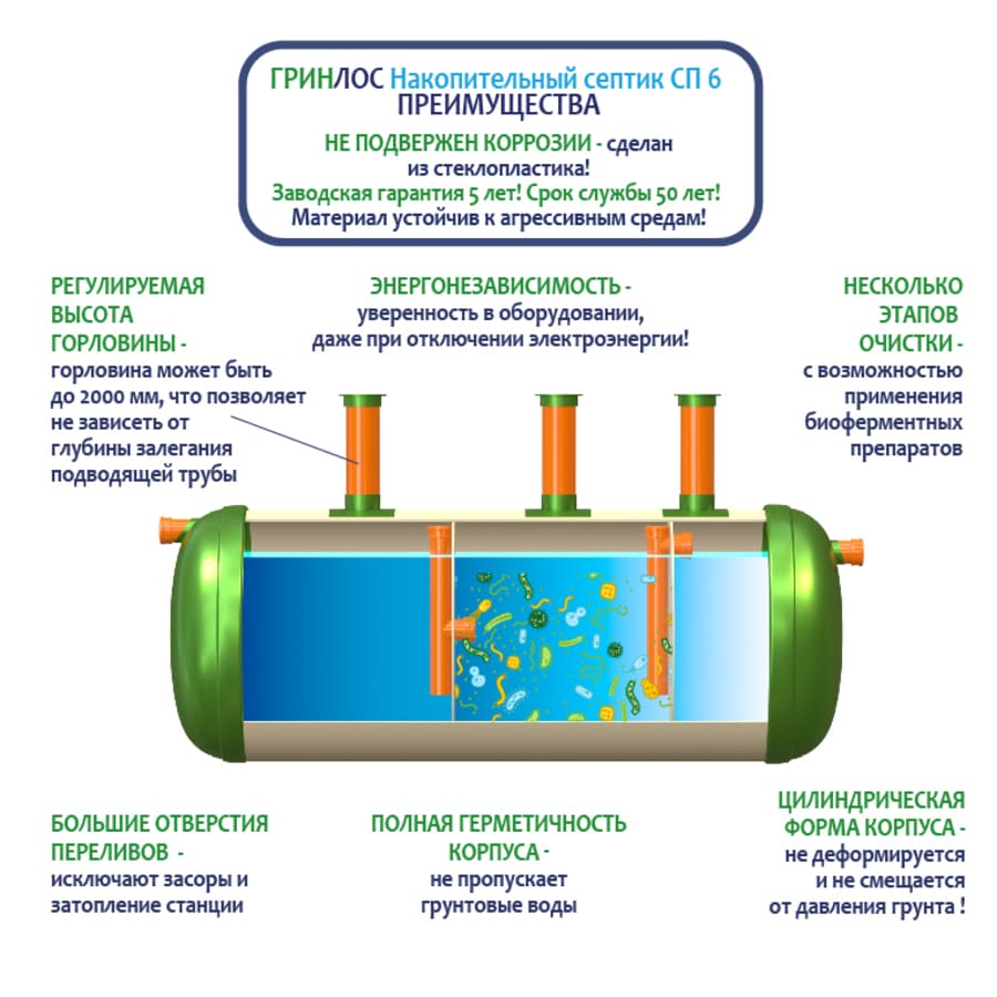 Конструкция Накопительный Гринлос СП 6 представляет собой цилиндр, выполненный из стеклопластика. Внутри цилиндр с помощью перегородок разделен на камеры, сообщающиеся между собой через отверстия для перелива.