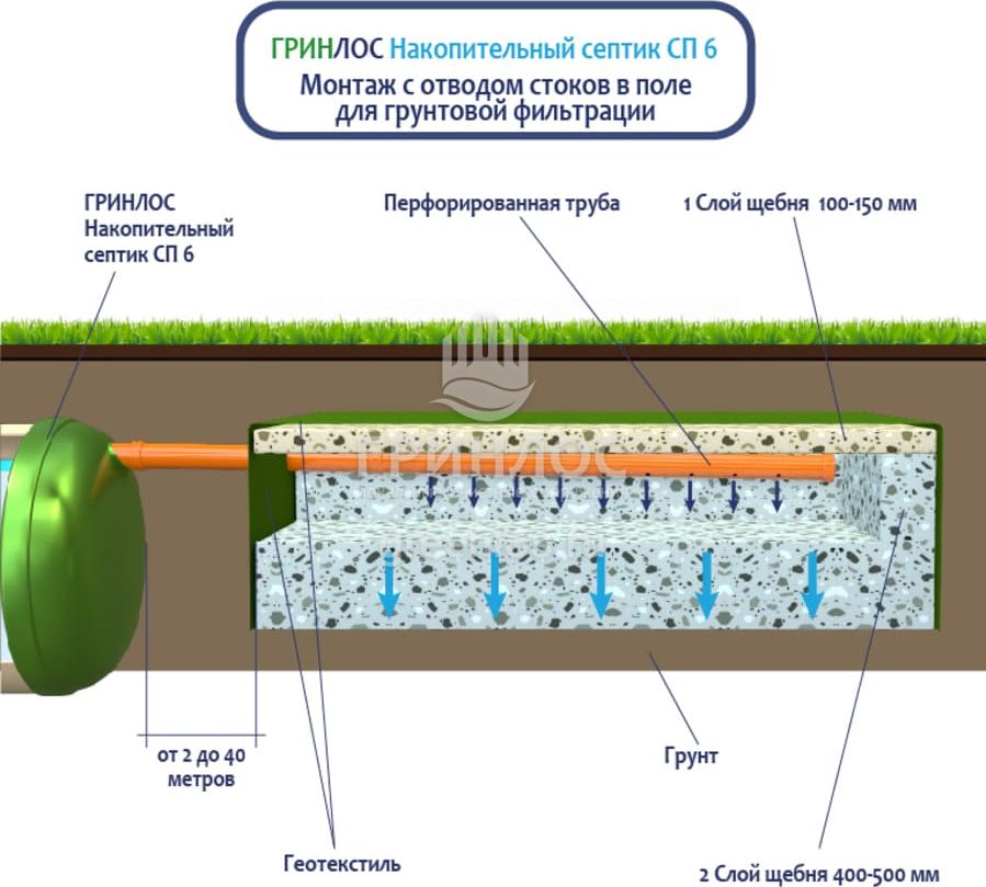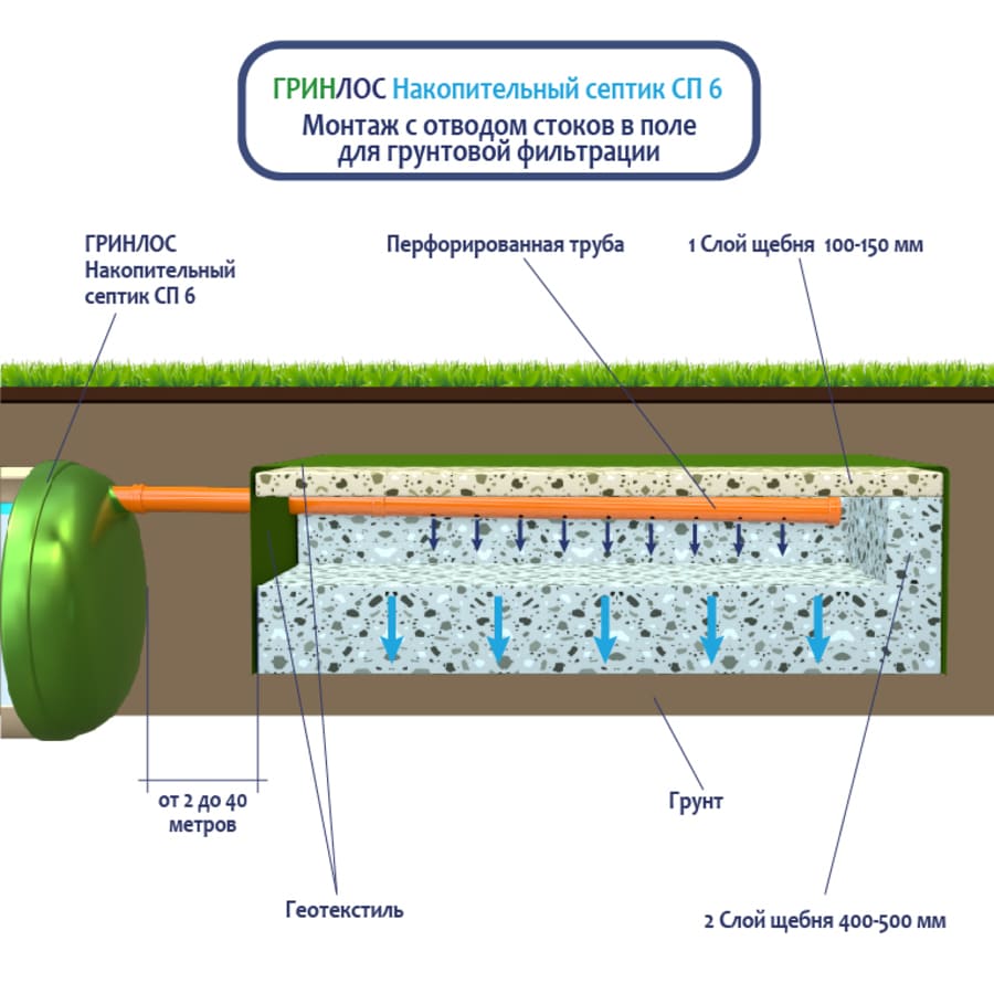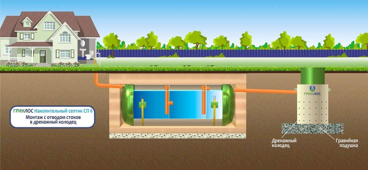 Монтаж с отводом очищенных сточных вод в дренажный колодец. Подходит для хорошо поглощающих грунтов (песок, супесь) и низком уровне грунтовых вод. Колодец поглощения может быть выполнен из бетонных колец или при помощи пластикового колодца с перфорированным основанием и стенками. При монтаже колодца поглощения на выпуск трубы рекомендуется смонтировать обратный клапан для защиты Накопительного септика Гринлос СП 6 от обратного затопления в периоды активного снеготаяния или в дождливое межсезонье. Непосредственно под выпуском отводящей трубы от септика рекомендуется смонтировать аварийный насос для дополнительной защиты Накопительный Гринлос СП 6 от обратного затопления из колодца поглощения.