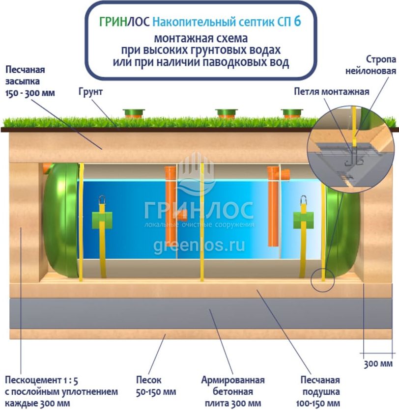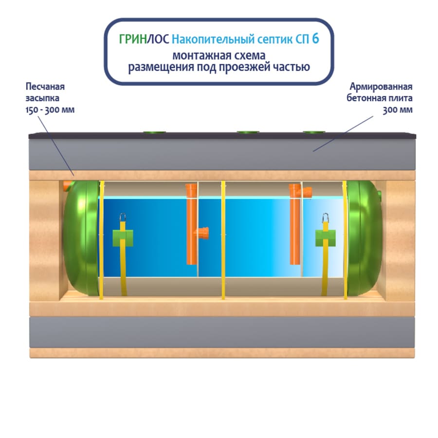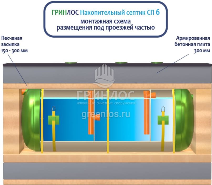 Накопительный Гринлос СП 6 - энергонезависимый септик накопительного типа, поэтому его следует располагать на участке так, чтобы к нему мог беспрепятственно подъехать ассенизационный автомобиль. Над местом установки Накопительного септика СП 6 не допускается движение и стоянка автотранспорта в радиусе 2,5 м. В случае необходимости проезда автотранспорта или организации стоянки, над очистным сооружением и над подводящей и отводящей трассами следует оборудовать разгрузочную плиту.