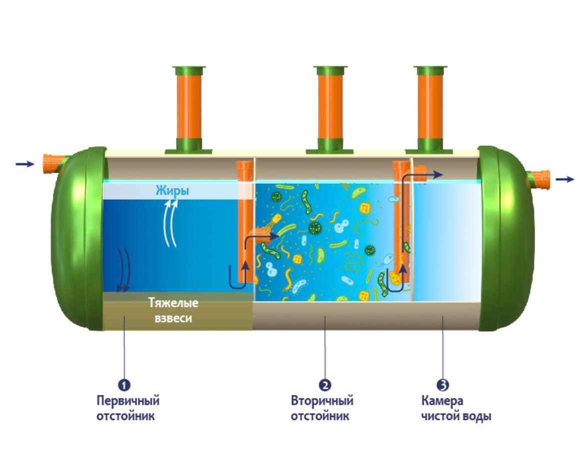 По канализационной трубе от дома сточные воды поступают в первый бак или отсек (первичный отстойник).