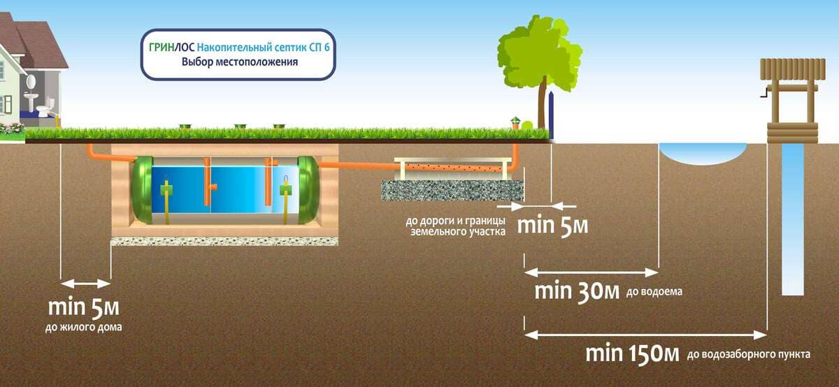 При планировке участка для канализационной системы с накопительным септиком ГРИНЛОС СП 6 следует учитывать следующие рекомендации: