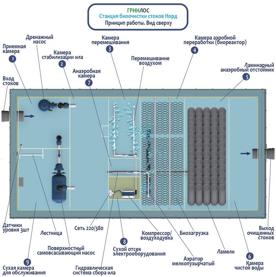 Станция работает на основе биологической очистки сточных вод с помощью активного ила. Для эффективной работы важно поддерживать благоприятные условия для микроорганизмов.