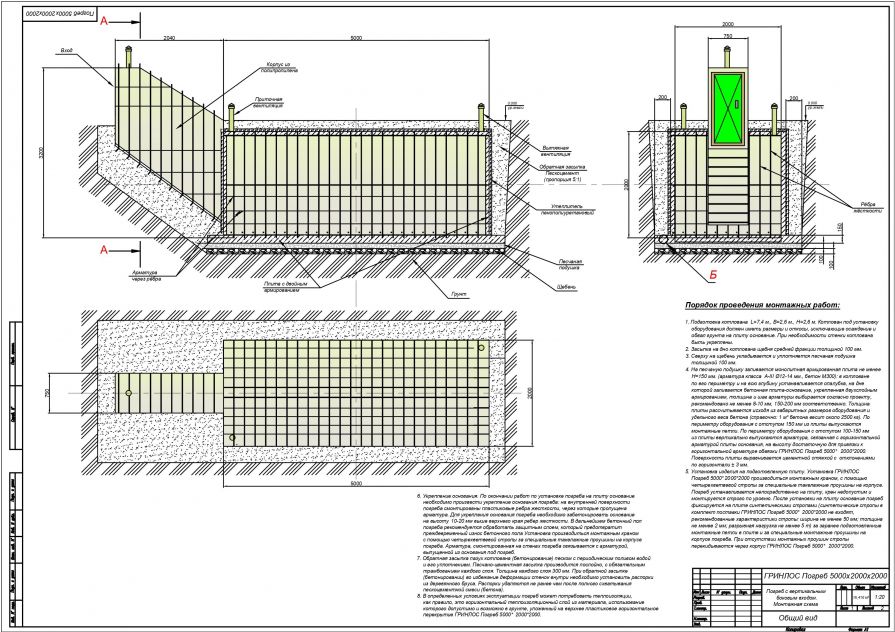 При проектировании и монтаже Гринлос Погреб ДТ 5000*2000*2000 необходимо руководствоваться рекомендациями Технического Паспорта, проектной документацией, рекомендациями проектировщиков, а также действующими нормами и правилами: СП 45.13330.2012 Земляные сооружения, основания и фундаменты; СП 70.13330.2012 Несущие и ограждающие конструкции; СП 12-135-2003 Безопасность труда в строительстве; СП 22.13330.2011 Основания зданий и сооружений; актуальное издание ПУЭ (правила устройства электроустановок). Лица, выполняющие монтаж, должны иметь опыт и необходимую квалификацию, подтвержденную документально, для проведения строительных работ, а также для использования необходимой для проведения работ техники, инструментов и механизмов.